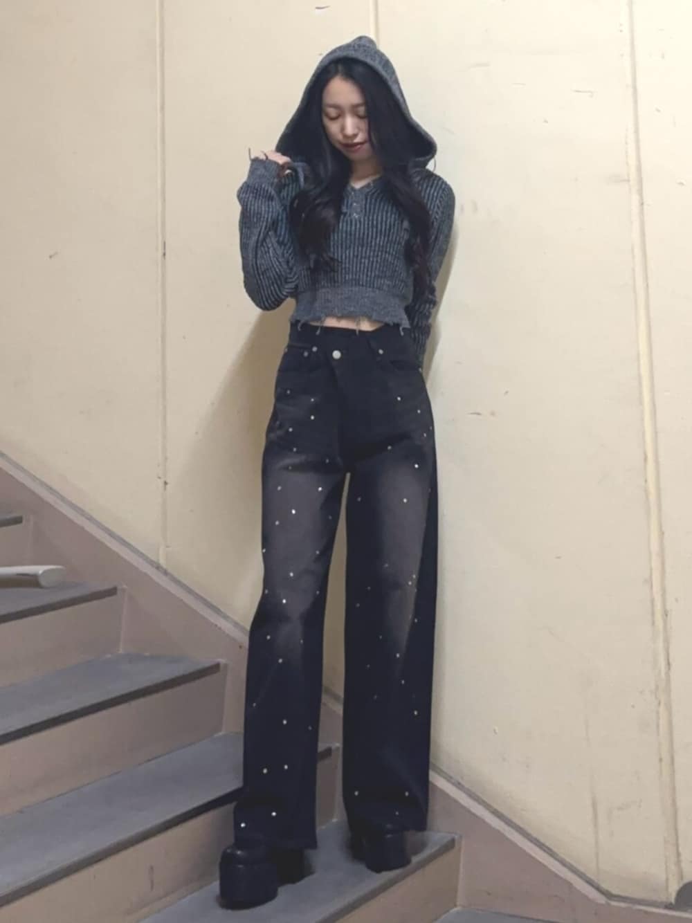 【トップス】 ダメージのデザインが可愛いニットです フードが大きめなので華奢に見せてくれます◎ 【デニムパンツ】 クロスのシルエットがウエストをより細く見せてくれます ワイドの中で細身のシルエットなので美脚に見せてくれます✨ 【ブーツ】 23cmでSサイズ着用しています 傾斜が少なくとっても軽いので歩きやすいです♡
