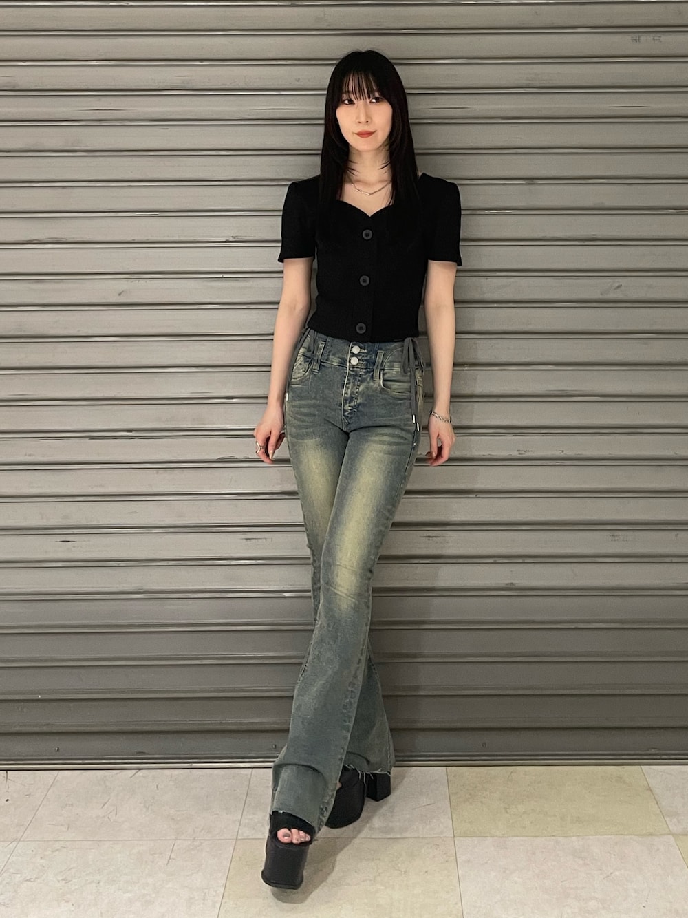 店頭でも人気のアイテムです! 綺麗め好きなら絶対ハマるはず🥰 サラッと1枚で着たいけどカジュアルは気分じゃないな〜って日にオススメ☺️ 【tops】 158cmでおへそくらいの丈です。 デコルテを綺麗に見せられるハート♡型のカットになっています!開きが深めに見えるので、胸元がが不安…と思うかもしれませんが、ガバガバしないんです🥹✨(私も最初不安でしたが、着たら全く気になりませんでした!!!) 裾につれて身頃が少し狭まるので、着るだけでウエストを細く見せてくれます🥰 EMODAのハイウエストのフレアパンツと相性抜群ッッ💖💖 後ろの首元がスクエアになっているため、後ろ姿まで綺麗ですよー!🤩✨ 薄手なリブ生地なので、Tシャツ感覚で着られます! 【denim】 158cmでXSサイズ着用です。 ウエスト部分にカットが入っていますが、位置が高く、開きは狭めなので露出度は高くないです!安心して着られますよ〜🙆♀️ ヒールは必要な長さですが、お家でカット可能です♡ 【shoes】 厚底好きにはたまらない14.5cmヒール! なのに高低差がなくてヒール履いてる感がないので歩きやすいです👍👍 普段22.5〜23.5cmでSサイズがぴったりでした。