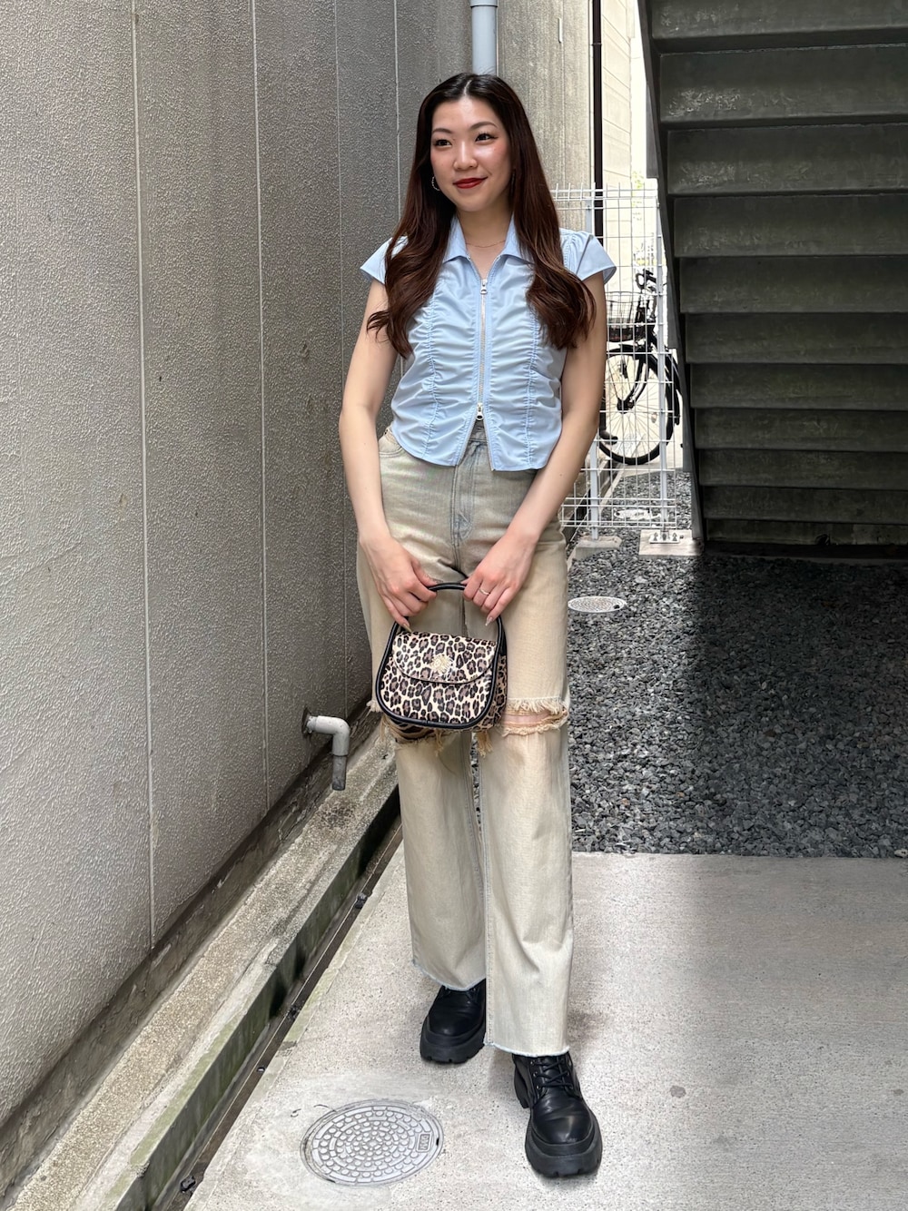 tops:ダブルZIPなので羽織としてもトップスとしても着れるので着回し◎ 生地が薄めなので涼しいです✨ denim:ワイドですが履くとストレートぽく見えるシルエットです!生地感が柔らかくて履き心地◎162センチでSサイズを着用しています。 bag:小さめですがしっかり容量入ります!おしゃれのワンポイントとしても使えて可愛い♡ shoes:長時間履いても疲れない万能シューズ!24.5センチでLサイズを着用しています。