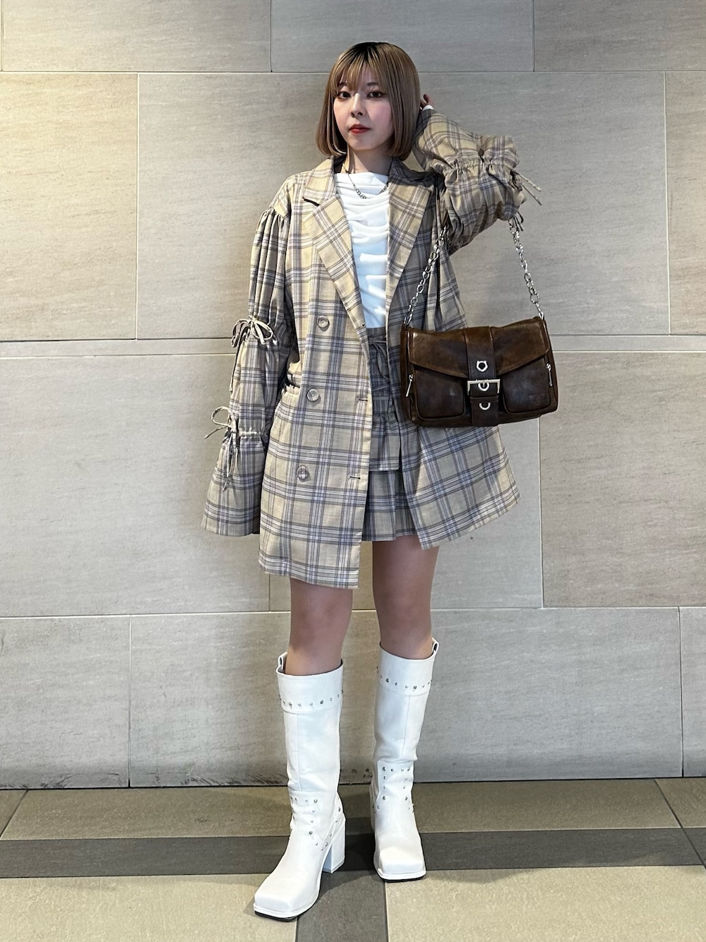 Instagram @shuno_12sky 【ジャケット】 身長153cmで膝の上くらいの丈感です! インナーにニットを着込めるくらいの少しオーバーサイズとなっています! 薄めの軽い生地感なので春夏の羽織としても着用いただけそうです🌟 【トップス】 オフショルのトップスで、首元がしっかり開いたデザインなのでお顔をスッキリ見せてくれます💓 【スカート】 身長152cmで太ももの真ん中より上のミニ丈となっています。短めですがインナーパンツが付いているので安心して着用いただけます。コルセットのようなデザインなのでウエストが細見えします! 【ブーツ】 足のサイズ23cmで、Mサイズを着用しています。ふくらはぎにはゆとりがあって、気温が上がる春夏でも着用しやすいアイテムとなっています❣️ 【バッグ】 HTHとのコラボアイテムです。大容量で高見えするデザインなので、系統問わず幅広いコーデに合わせていただけます!