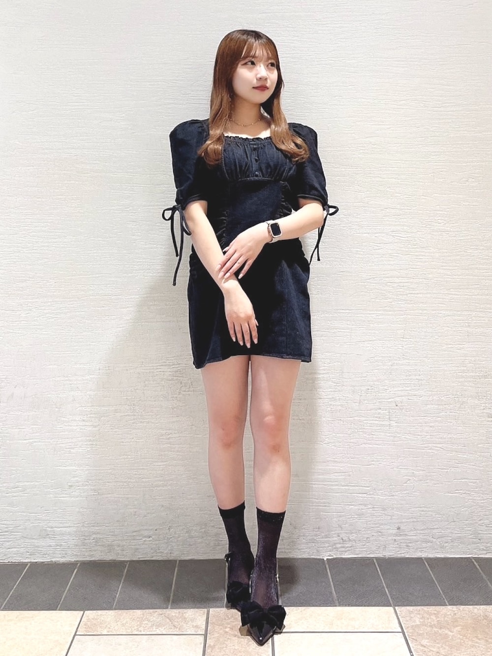 【ワンピース】 158cm Mサイズ着用 袖はパフスリーブでスカート部分はぬIラインでスタイルアップが叶っちゃいます👌🏻´- 胸下で切り替えがあるので脚長効果抜群! スカート部分もタイトすぎずストンと落ちるデザインなので体のラインが出すぎるアイテムが苦手な私でも安心して着用出来ました◎ 【シューズ】 普段のサイズ23.5cm 。Mサイズ着用 トレンドのリボンパンプス🎀 リボンの取り外しが可能なので様々な場面でお使いいただけやす✨️ 靴下合わせもかわいいので年中履けるのも嬉しいポイント◎