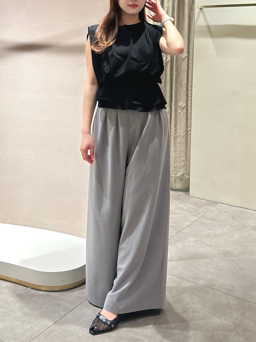 【トップス】 柔らかい素材でラフに着られるノースリーブカットソーです✨ 程よいペプラムシルエットなので一気に綺麗めコーデになります🎵 パンツ合わせはもちろんタイトなスカートと合わせてフェミニンにも着ていただけます🤍 【パンツ】 158cm Sサイズ ゆるっとしたシルエットですがタックが入っているのと、ハイウエストなシルエットでカジュアルすぎず履いて頂けます✨️ 【シューズ】 普段23.5-24.0 Lサイズ トレンドのハトメデザインでコーデのアクセントになるパンプスです👟🩶 アッパー部分がシアーなので夏でも涼しく履けちゃいます!