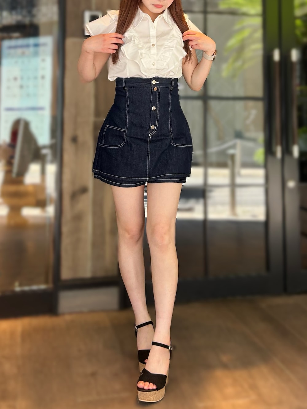 【トップス】 二の腕カバーばっちり!なフリルブラウス🪽 骨格ストレートの私はボタンを1つあけて首もとがスッキリ見えるように着るのが好きです🙆🏻♀️ ̖́- 【ボトムス】 とーーってもハイウエストでスタイルアップ効果抜群です!! ショートパンツなのでミニでも安心💭💖 色違いのブルーはカジュアル派さんにもってこいです🩵