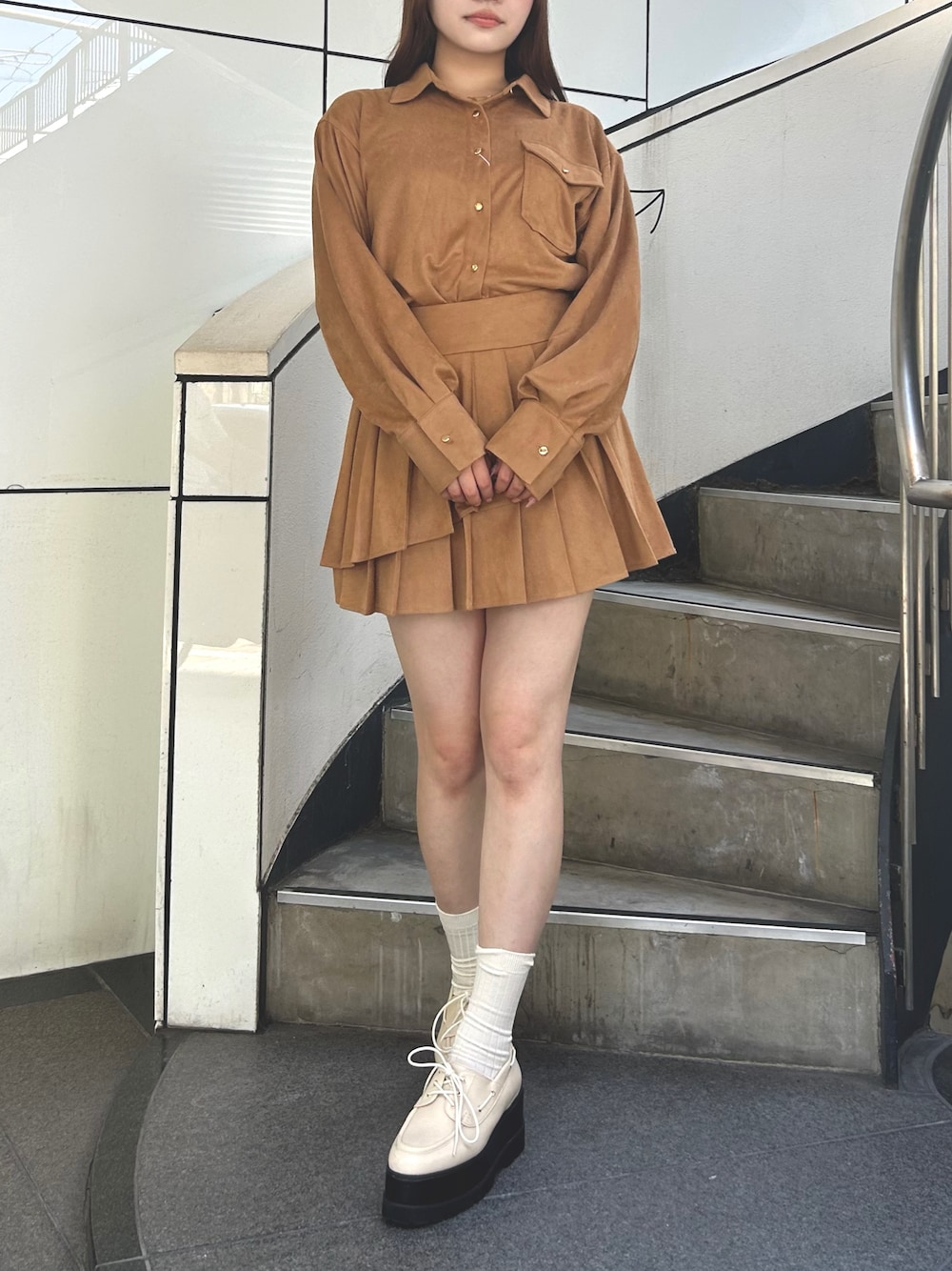 【トップス】 スエード素材がかわいいオーバーシャツ👔 カラーによって素材が違い、キャメルのみスエード素材で一気に秋らしく着こなせます🙆🏻♀️🤎 セットアップでスカートもあるのでミニ合わせでガーリーに、お持ちのパンツ合わせでカジュアルにも着れちゃいます✨ 【スカート】 セットアップ対応!ダブルプリーツなのでコーデが一気に華やかになります🧸 【シューズ】 7.5cmの厚底なのでスタイルアップ🎵 どんなコーデにも合わせやすい秋冬1足は持っていたいアイテム👞🤍
