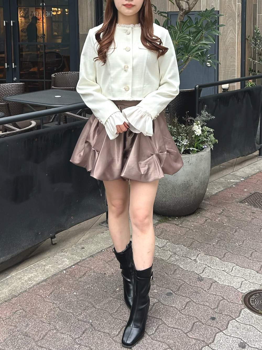 【ジャケット】 カフスが取り外せる2WAYジャケットです🧥 スカートあわせでフェミニンに、デニムあわせでキレイめカジュアルな雰囲気で着用いただけます✨✨ ショート丈なのも嬉しいポイント💭 【スカート】 大人気のバルーンスカートがサテン素材で再登場✨ コンパクトなサイズ感がお好きな方はSサイズ、ボリューミーなシルエットがお好きな方はMサイズがおすすめです! 【シューズ】 普段23.5cm で Mサイズを着用しています