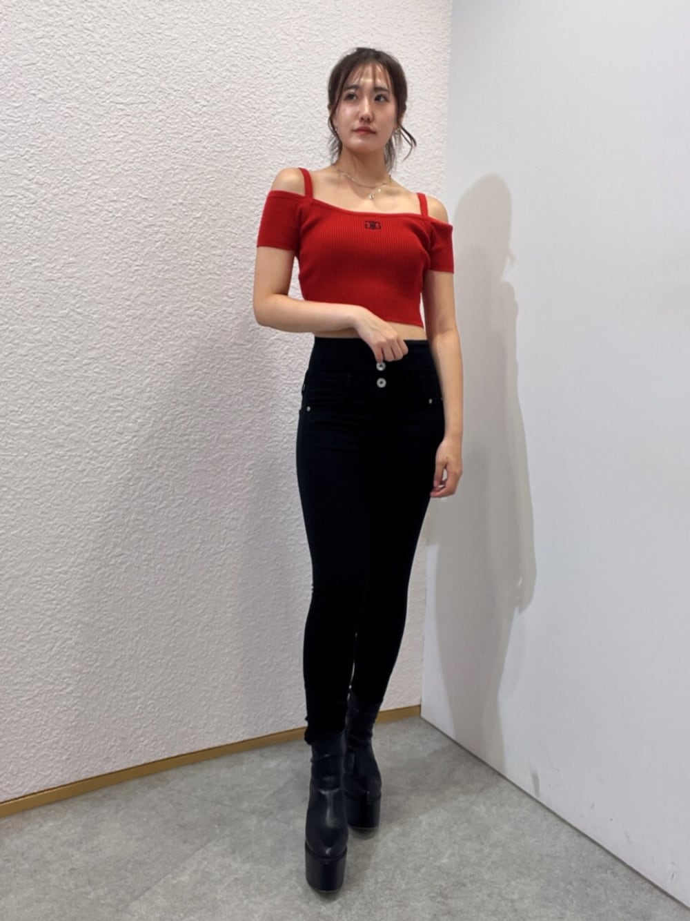 【トップス】 サラサラ生地で夏でも汗が染みること無く、涼しく着用できる生地感のトップスです! オフショルなのに肩に上がってこないため、ストレス無く着用できます😊 【ボトムス】 腰の部分がクロスになっていて程よい露出感のあるデニムパンツです! 馴染むのが早いのでこればかり履いてしまうくらい履きやすくなります😌 ちなみに165cmの私はSサイズを着用しています👀✨ 【シューズ】 内側にファスナーがついていて、着脱しやすいデザインのブーツです! 高いヒールですが,履いてみるととても軽く足に負担がかかりづらいアイテムです! 24cmの私はLを着用しています☺️