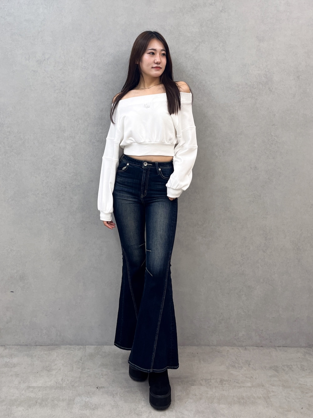 【トップス】 スウェット生地のオフショルのトップスは,ワンオフショルとしても着用できます!! プレートがワンポイントでシンプルなデザインなので着回しできるアイテムです! 【ボトムス】 ハイウエストのシンプルなデザインなので、どんなお洋服にも合って、着回しができるアイテムです!!フレア部分の広がりが大きいため、足を細く見せる効果があります! 165cmの私はSを着用しています😊 【シューズ】 ムートンタイプのブーツで、裏起毛でもあるので寒い冬にぴったりです!! デザインもシンプルなので、とても使いやすいです♪ 24cmの私はLを着用しています!