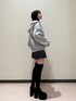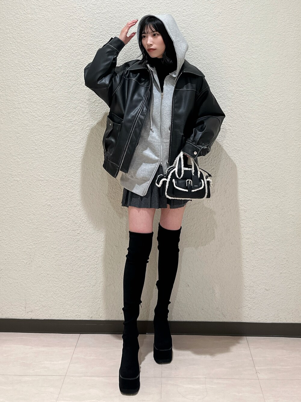 大人気フーディパーカーコーデ🖤 【ブルゾン】 大人気のレザーブルゾン こちらもオーバーサイズなのでインナーでたくさん着込めます♡ 166cmでお尻隠れるくらいの丈感です 【パーカー】 今からすぐ着れちゃうオーバーサイズのフーディパーカー!もちもちとした生地感でシルエットが綺麗に出ます!トレンドのダブルジップになってます♡ 【スカート】 レイヤードでも履けるスカートで切りっぱなしが可愛いプリーツスカートです 166cmのSサイズ着用で太ももくらいの丈感です🤍 【ブーツ】 EMODA大人気のニーハイブーツ。 しっかり厚底ですが本当に軽くて歩きやすいです! 盛れすぎ注意です、、、🥹 24.5cmでLサイズ着用しております⭕️