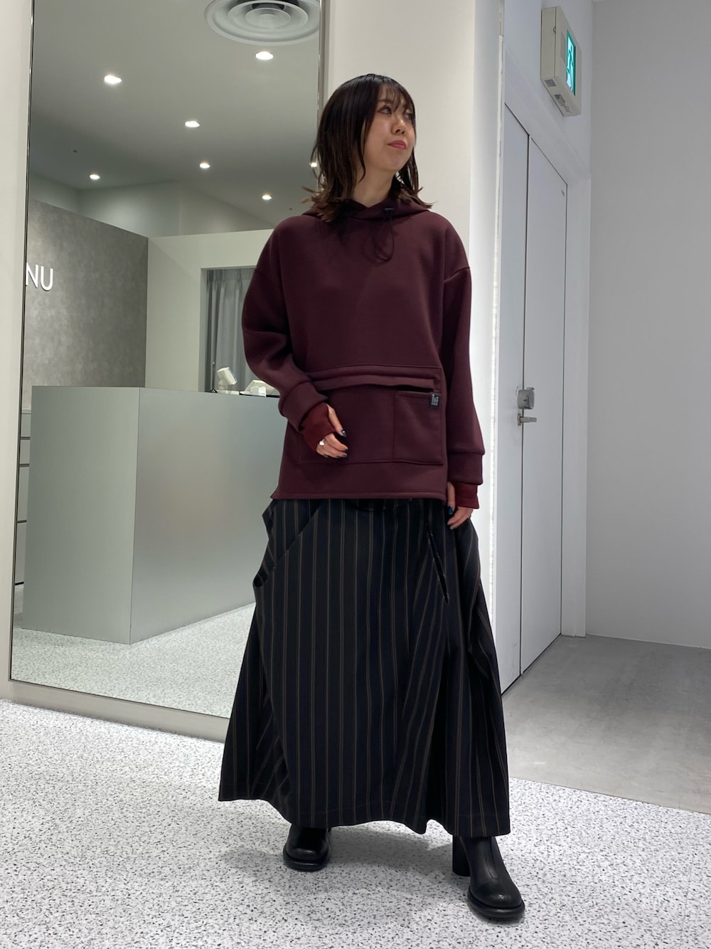 カジュアルモードコーデ 【トップス】 デイリーに使いやすいフーディー。生地がもちもちしてる素材なのでカジュアルすぎない印象に✨裏起毛ではないのですが、裏起毛無しが早い時期から春先まで着れるのでおすすめです。 【スカート】 人気のピンストライプシリーズのスカート。タックのデザインがUN3D.っぽくモードな印象に。腰回りはすっきりしたシルエットなのでトップスをインでもアウトでも合わせやすいです🙆コーデの様にカジュアルトップスと合わせるとモードなスカートも普段使いばっちり出来ちゃいます!