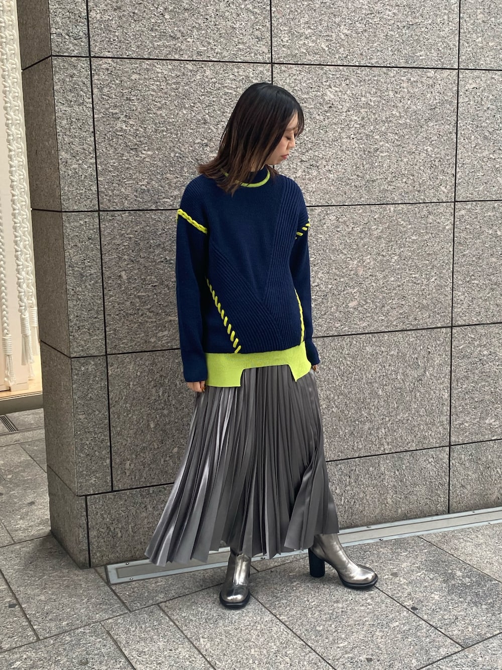 冬のカラーコーデ 【トップス】 大ぶりにステッチされたデザインが目を引くニット🧶ローゲージでカジュアルな印象なのでデイリー使いにぴったりです!厚みもしっかりあり暖かいですが、配色の切り替えでメリハリがしっかり出るので着膨れせずにいろいろなボトムと合わせて頂けます♪ 【ボトム】 定番シリーズのプリーツスカート。ランダムにプリーツが入っているので腰回りの広がりが気になりません😊また、プリーツは手作業で加工しているのでとても綺麗なシルエットです!一つ持っていたらオンオフいろんな場面で大活躍間違いなしです!