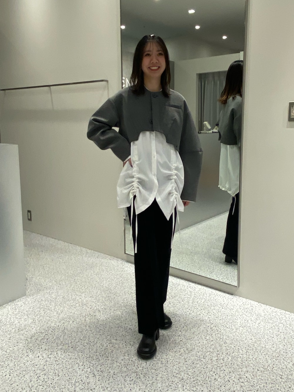 YURIN(UN3D.)のノーカラージャケット「IRREGULAR HEM SHORT JK / イレギュラーヘムショートジャケット」を使ったコーディネート