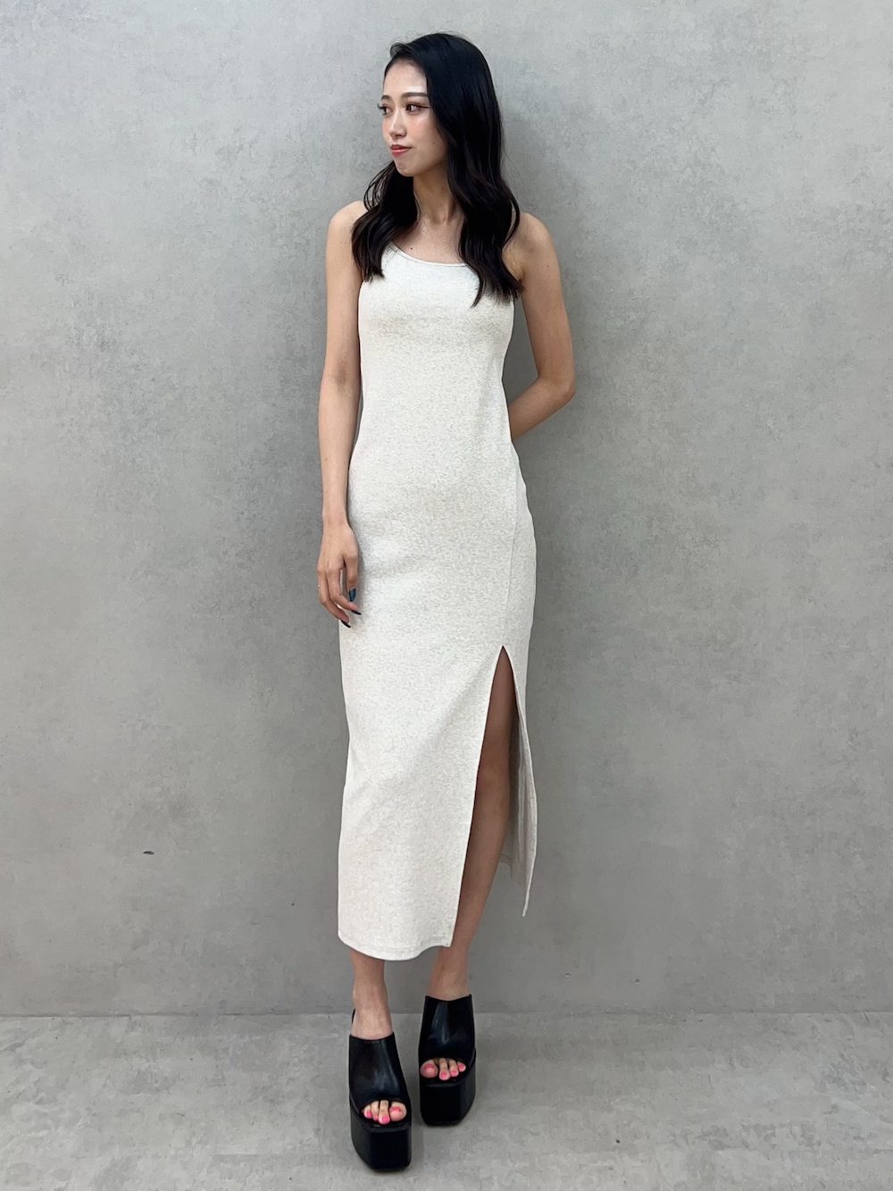 shiori(GYDA)のワンピース「SIDE スリットテレコキャミロングワンピース」を使ったコーディネート