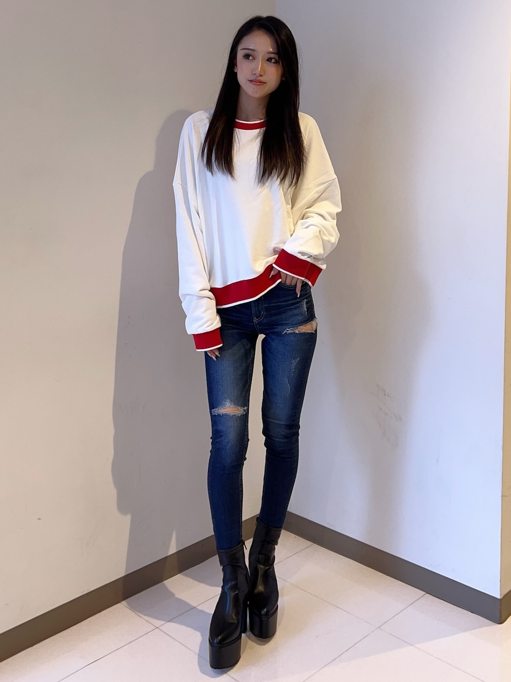 【トップス】 バックのGYDAデザインが大胆でとても可愛いスウェットトップスです! 168cmでお尻が隠れないくらいの丈感です! デニムやミニボトムス合わせがおすすめです! 【ボトムス】 定番なミドルウエストSIDE RIPPEDスキニーデニムです! 伸縮性があり馴染みやすく履きやすいです! 168cmでXSサイズを履いてくるぶしが見える丈感です! 【シューズ】 ヒールが12.7cmの厚底ショートブーツが登場✨ 高低差があまりなくとても履きやすいです🙆🏻♀️ 24.5cmでLサイズを履いています!