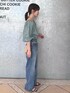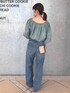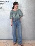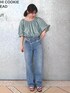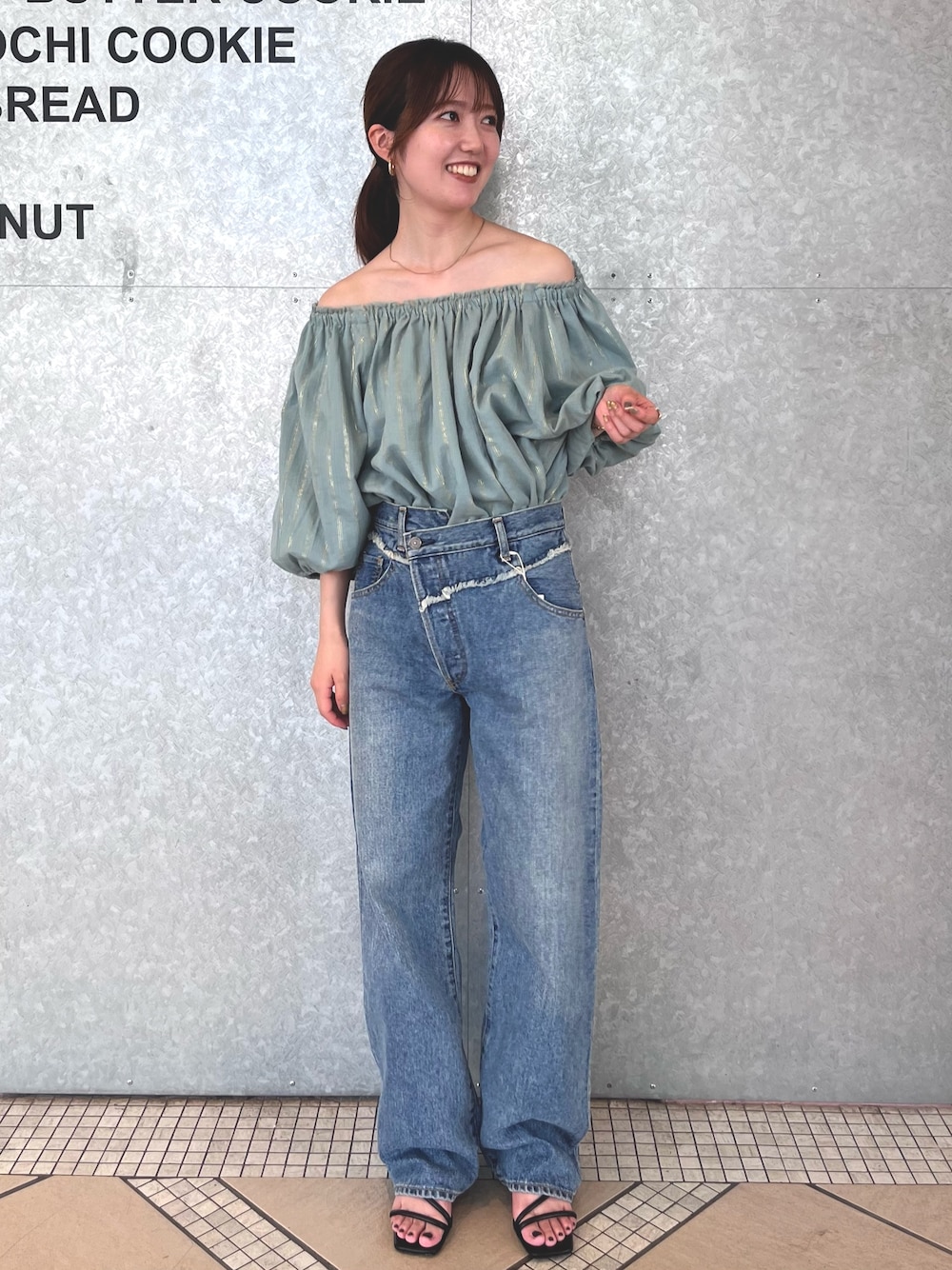 【トップス】キラッとラメが可愛いブラウスです✨袖をまくってぽてっとたまるシルエットもお洒落に見えます😊 【デニム】ウエストのリメイクデザインがポイントのストレートデニム👖158cm/24inch着用です!やや細身のシルエットで、ライン拾われすぎず綺麗に履けます♡