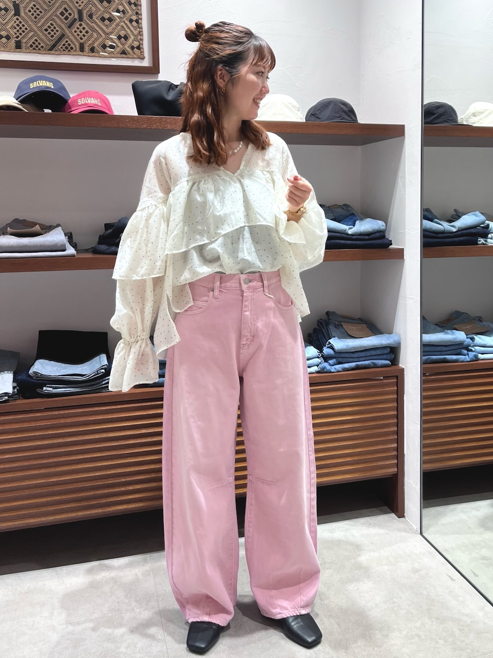 【トップス】着るだけで華やかにみせてくれるフリルブラウス🤍ドットとレースの2種類あります😊 【デニム】大人気のカーブシルエットから、生地が柔らかく、新色も追加して登場💖158cm/24inch着用で裾折らずに履けました!程よいずるっと感が可愛いです♡