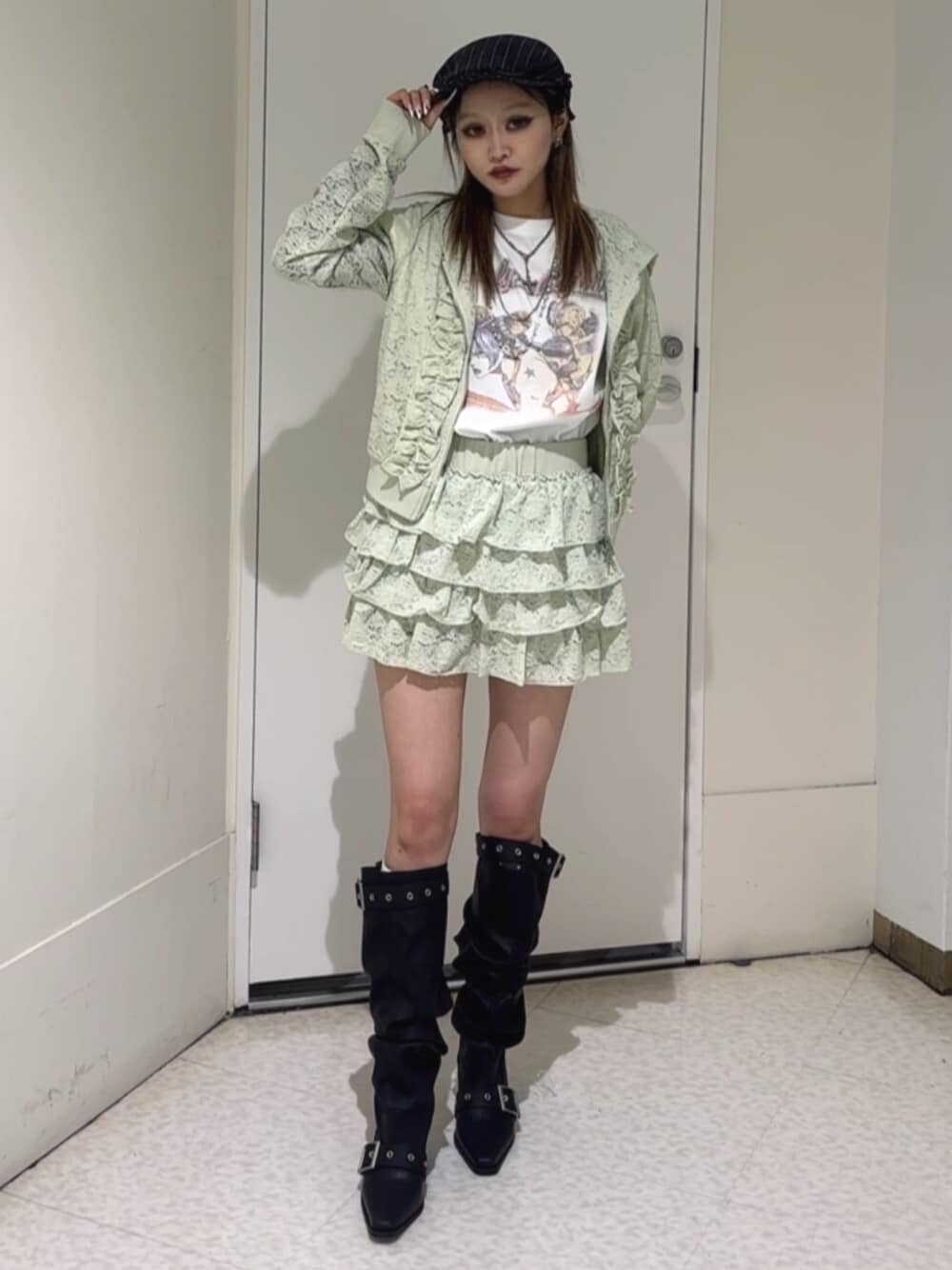 【トップス】 JOJOコラボトップス!フリルのつけ襟セットのトップスです!半袖になっていて、いまからの時期にぴったりなトップス🖤JOJOお好きな方も、そうでない方でも着れるぐらいにすっごく可愛いデザインになってます!! 【フーディー】 全体がレースになっているフーディー!全部レース生地なのめちゃかわです♡ 私は春らしいミント色を着てみましたが、ほかのお色もとっても可愛いです!生地がサラッとしているの)、真夏にキャミソールとか、キャミソールワンピースなどの羽織としてきてもカワイイです🖤 【スカート】 ウエストがしっかりゴムになってて履きやすいです!レースなのでどんなお洋服にも合わせやすいのがポイントです!!🖤インパン付きなので女性の方はすっごく安心して着れると思います!! これからの時期レースアイテム1つ持っていても、コーディネートの幅が広がって可愛く着れちゃいます!! 【シューズ】 普段23.5cm履いていて、これはMサイズです!! ヒールも高くないので履きやすいです! 流行りの形になっていて、ハトメベルトが着いてるのもjouetieらしくて可愛いです🖤ྀི