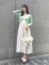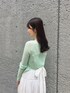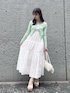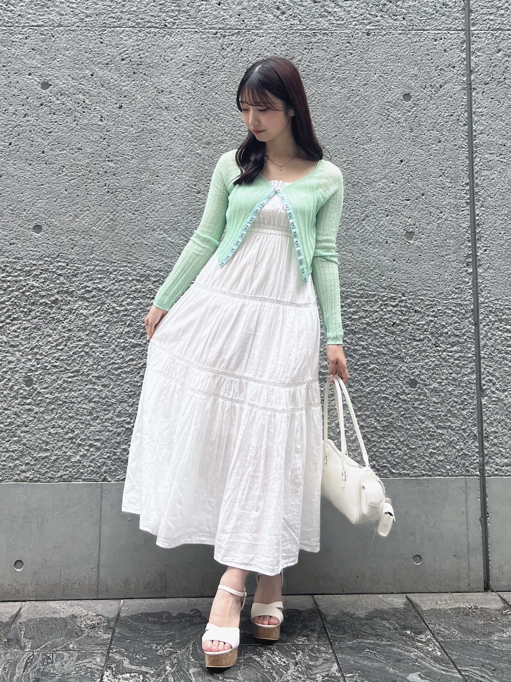 【カーディガン】 レース風の生地でスッキリとしたシルエットのカーディガンです!ホックのデザインがコーディネートに辛さをプラスしてくれます。ホックを全て閉めてトップスとしても着用出来ます✨️ 【ワンピース】 夏らしいコットン素材のキャミワンピ。サイドのウエスト部分が空いており、さりげなく肌見せができます!バックリボンで後ろ姿まで可愛くなります🎀 グリーンのカーディガンを差し色にしたホワイトコーデです🕊