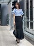【トップス】 デコルテのリボンとボリュームのあるフリルがガーリーなブラウス。フワッとしたシルエットが華やかで主役級の1枚です♡ ミニスカートと合わせるとより可愛らしい雰囲気になります! 【ボトムス】 シンプルなデザインで着回しが効くマーメイドスカートです。バックにスリットが入っており大人っぽく上品な印象になります! 【シューズ】 バレエシューズのようなデザインが可愛いサンダル。スパンコールが縫い込まれており光に当たるとキラッとします✨