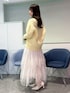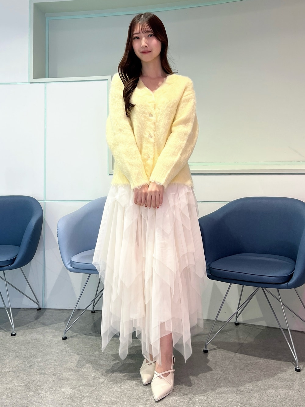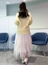 【トップス】 淡いイエローが春らしいミドル丈のカーディガン。 金色のボタンで華やかな印象に🌼 【ボトムス】 ふわっと広がるチュールのティアードスカート。 程よいボリューム感があり大人可愛いコーデにしてくれます🪞 【シューズ】 クロスベルトのパンプス。 24.5cmでLサイズ着用です!