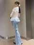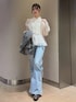 新作アイテム着回しコーデ☀️ ♡着回しアイテム→ジャケット/トップス/ボトムス 【ジャケット】 ベーシックな形で使いやすいシングルジャケット!肩にサッとかけるだけで大人スタイルに✨️温度調節にもピッタリです! 【トップス】 シアー素材で春らしいボウタイブラウス♡パフスリーブですが透け感があり肌が少し見えるので肩幅が気になりにくく着やすいと思います!ペプラムシルエットで腰周りをスッキリ見せてくれます!リボンは取り外し可能です! 【ボトムス】 後ろ側に大きなリボンが施されたデニムパンツ🎀フレアパンツなので全体的にスッキリしたシルエットになっており、リボンに目線が行くため太ももやふくらはぎは細く見えて着痩せ効果も抜群です◎ 【シューズ】 シンプルなショートブーツです!24.5センチでLサイズ着用です!