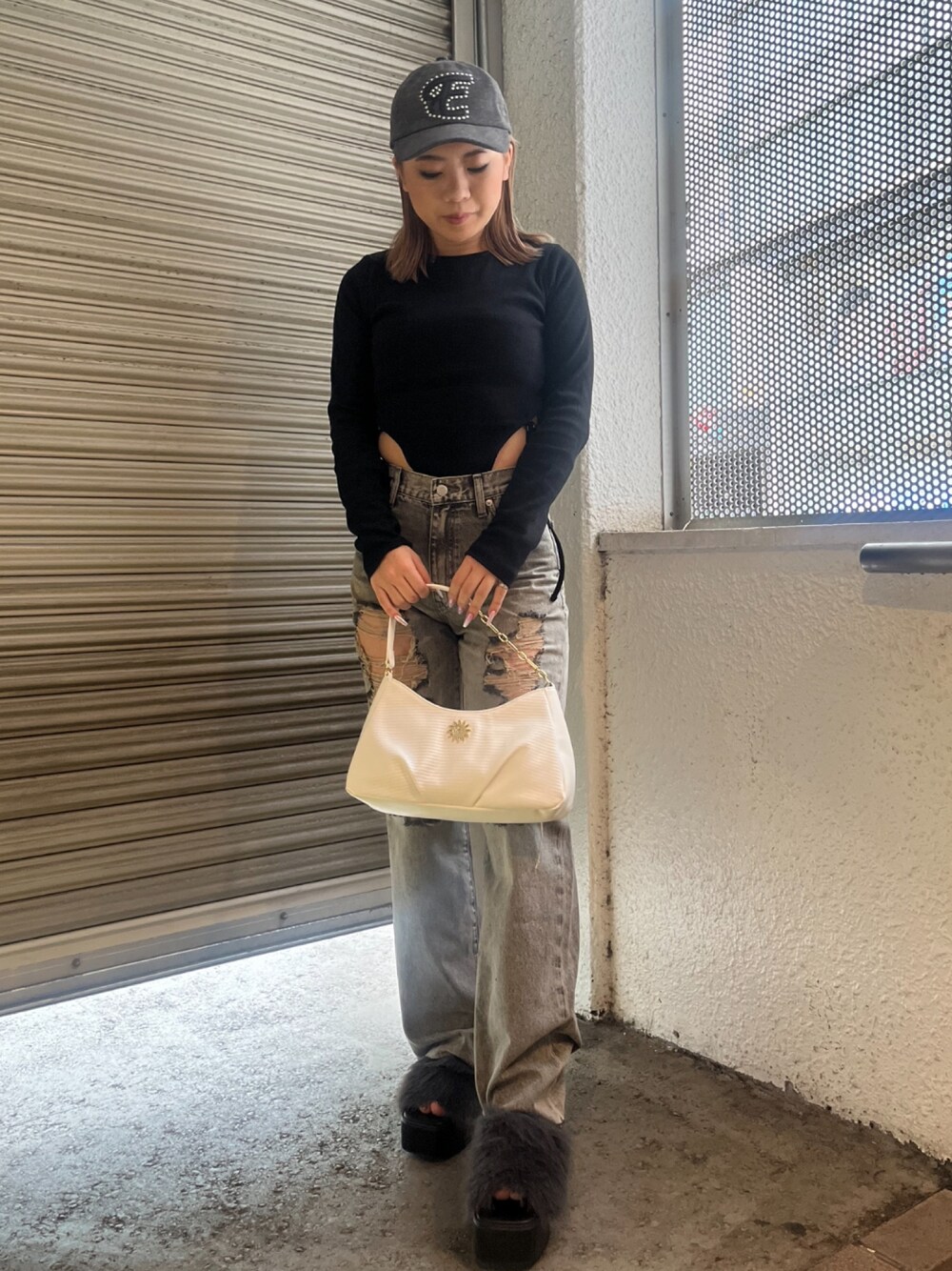 【トップス】ボディースーツの様に着られるトップスです。股下のスナップボタンがない為、楽にご着用頂けます。後ろの程よい肌見せがセクシーです🫶デニムやカーゴパンツ、ミニスカート等で合わせても可愛いので着回し抜群です! 【バッグ】EVRISのサニーちゃんがワンポイントで可愛く、サイズ感も少し大きめなので長財布と少しの化粧品なら全然入ります🙌💓 【サンダル】ファーになっているのでこれからの季節にぴったりのデザインになってます!♡ミニ丈に長めのソックスで合わせて頂いても可愛いです🫶23.5cmでMサイズ着用しております。 【キャップ】デニム生地でラインストーンが付いているのでトレンド感たっぷりです!♡♡