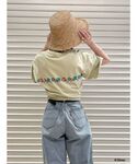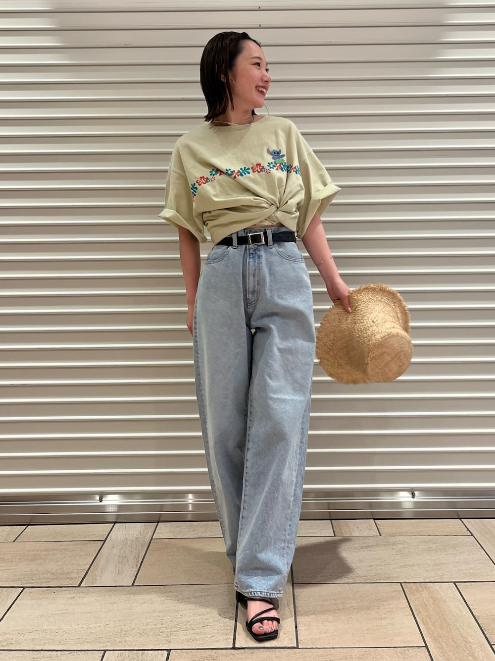 【t-shirt】夏感じるスティッチコラボのTシャツ🌺袖も丈感もゆったりめでお尻くらいまであったので、縛って短めにアレンジしてます💫スティッチは胸元にちょこんとプリントされてるだけなのでキャラクターTシャツ苦手な方にも着ていただきやすいと思います☺️ 【denim】サイズ豊富なデニム!154cm、24inchだとヒール履くとテーパードの形綺麗に履けました✨骨盤しっかりめの骨格ウェーブですが、ライン拾わない美脚デニムです! 【hat】Tシャツ×デニムの夏定番コーデにこの帽子があるだけで一気におしゃれ見え👌🏽リゾート感強すぎないので普段から使いやすいアイテムです✨