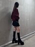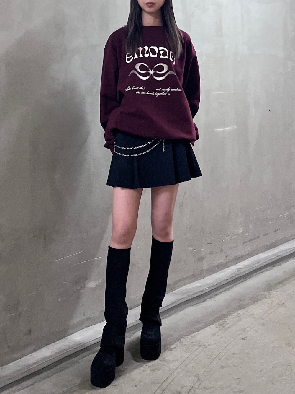 【トップス】 かなりオーバーサイズで身長173cmでもゆったり着用できます👍大きめなロゴがお洒落で、ダル着感無く着て頂けます✨ 【スカート】 チェーン付きのプリーツミニスカーと🤍 チェーンは簡単に取り外しが可能なので気分に合わせて着用頂けます👍インナーパンツも着いているので安心です✨ 【ブーツ】 フレアカバーデザインが脚を綺麗に長く見せてくれます🤍厚底ですが傾斜が少なくとても歩きやすいブーツです✨25.5cmでLサイズがちょうどでした👢