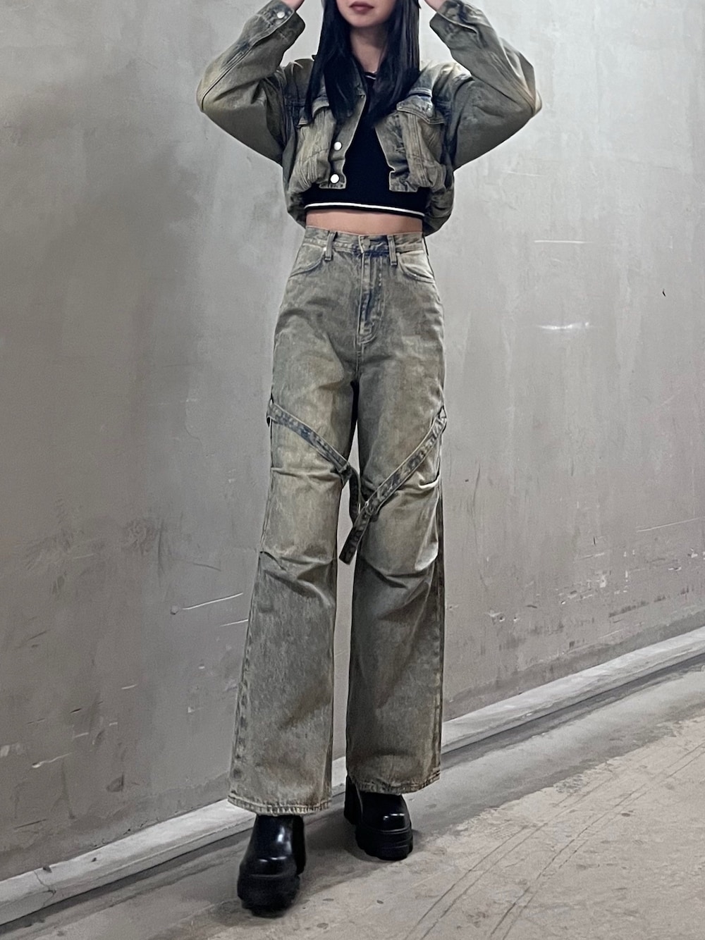 【アウター】 バルーンデザインでシルエットが可愛いデニムブルゾン✨ショート丈なのでウエスト位置を高く魅せてくれます👍袖周りはゆとりがあるのでとても動きやすいアウターです✨ 【トップス】 1枚でも可愛いですがショート丈でシンプルなデザインなので丈短めのアウターのインナーとしてもぴったりです👍 伸縮性のある素材で着心地もとても良いです✨ 【デニム】 ベルトデザインがかっこいいワイドデニム🤍 ヒップ周りのシルエットが綺麗でハイウエストなのでワイドですがスタイルアップ効果があります✨身長173cmでMサイズ着用しております👖 【ブーツ】 厚底ですが傾斜が少ないので安定感抜群です✨疲れにくく歩きやすいのがポイントのショートブーツです👢25.5cmでLサイズがちょうどでした!