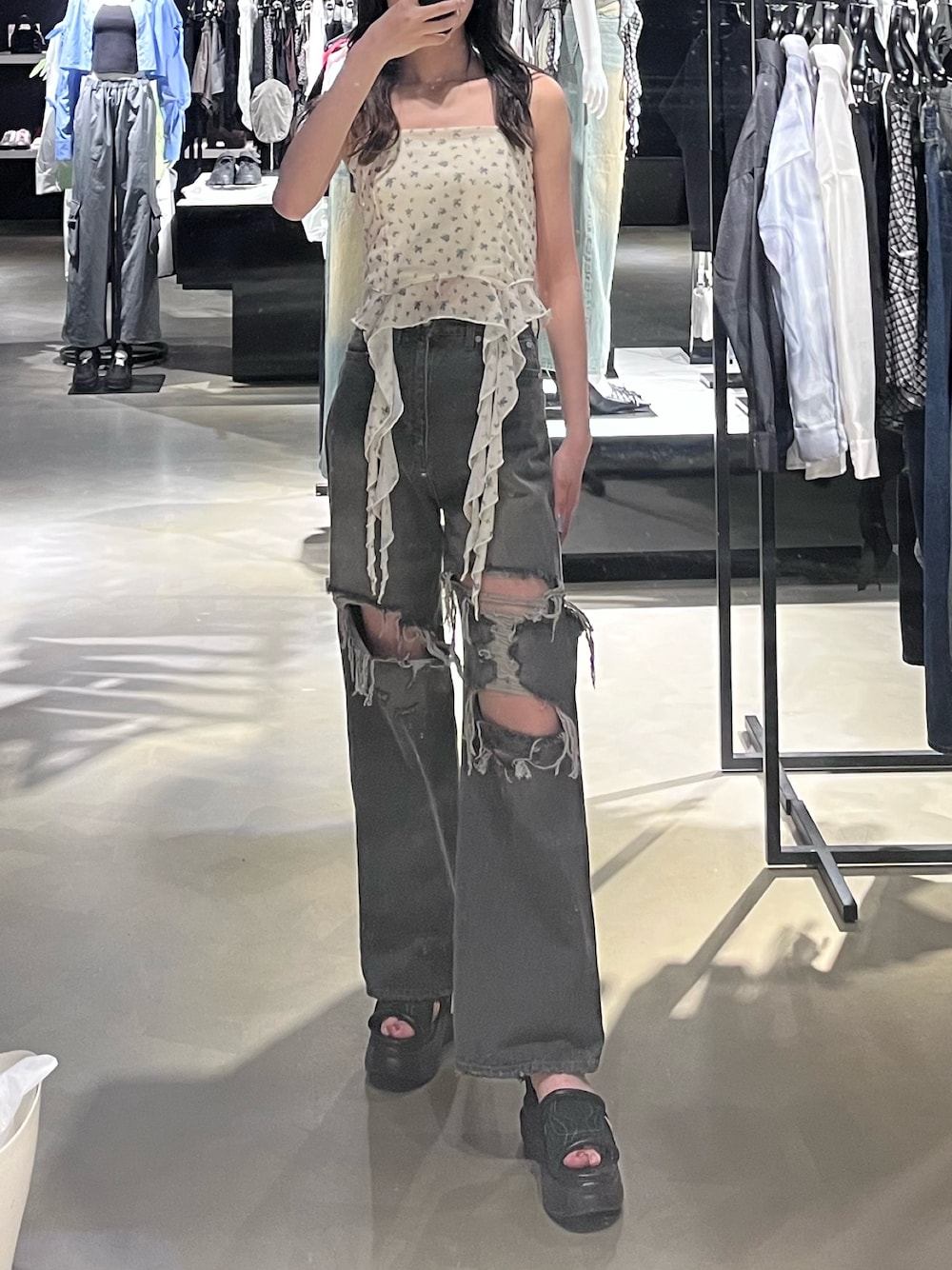 【トップス】 裾から垂れるラッフルデザインがポイントのキャミソール✨パワーメッシュ生地を使用しているので伸縮性があり着心地良いです👍 【ボトムス】 ダメージが大きめに入っていてインパクトのあるワイドデニム♡前だけでなく後ろにもダメージが入っています✨身長174cmで Mサイズを着用しております👖 【サンダル】 刺繍デザインが目を惹く厚底のサンダル✨ 軽くてとても歩きやすいです♡マジックテープなので脱ぎ履きしやすいのもポイントです👍25.5cmでLサイズがちょうどでした👢
