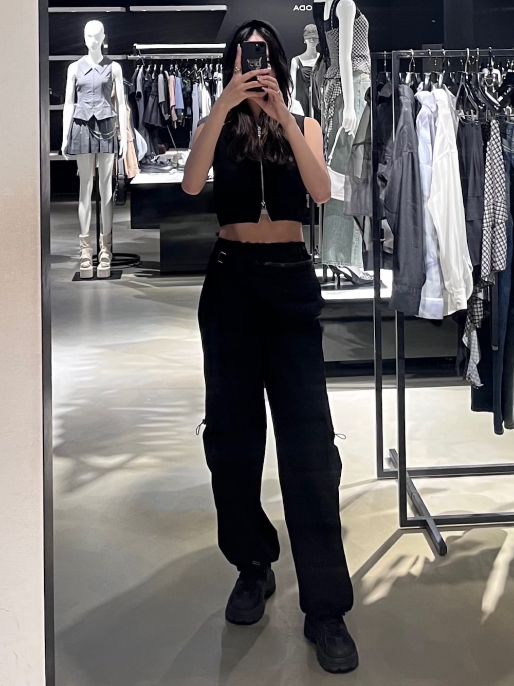 川越祐莉(EMODA)のタンクトップ「ショートボックスフーディタンクトップ」を使ったコーディネート