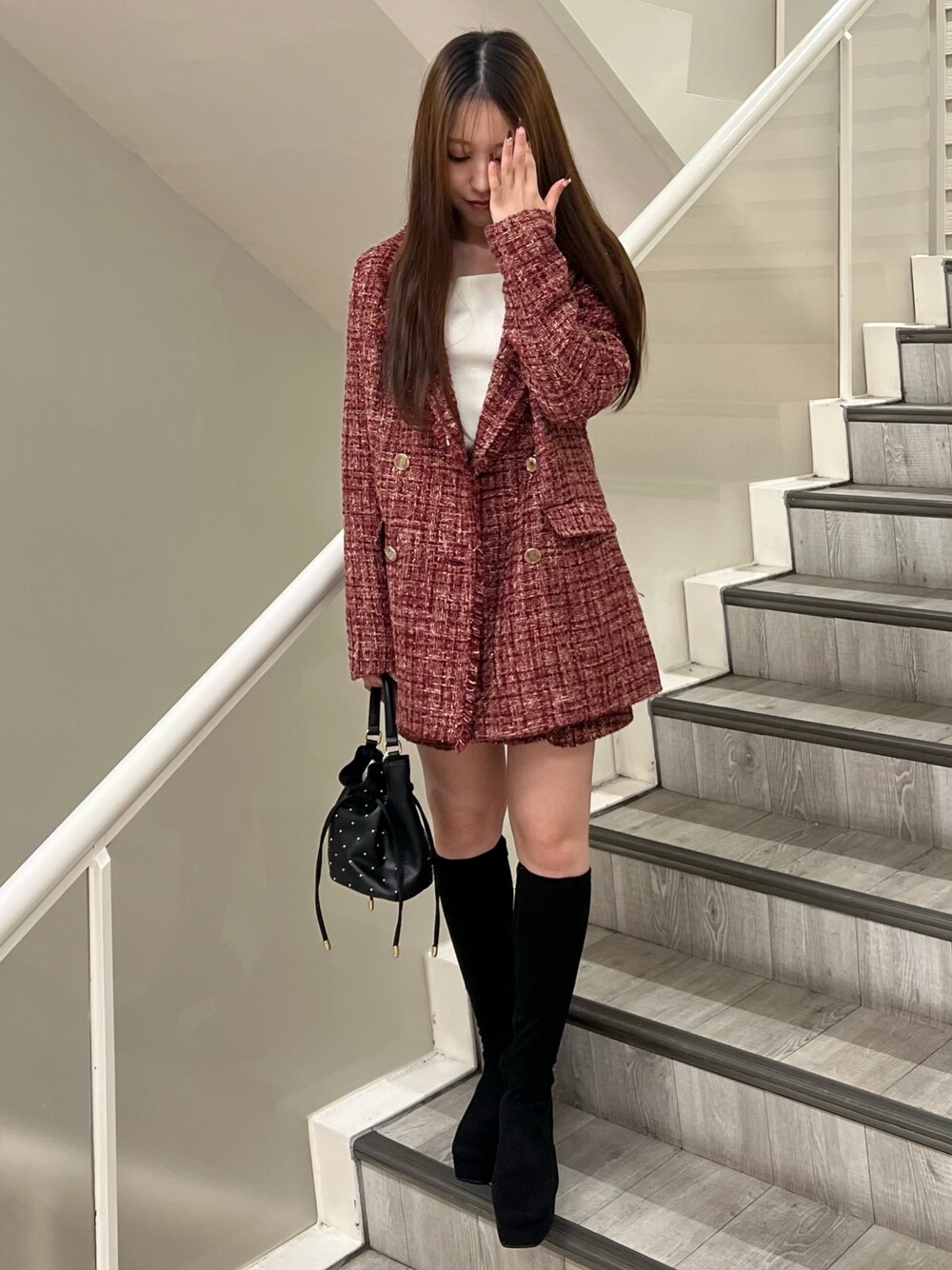 細見えツイードセットアップ♡ [ジャケット] 身長154cmでヒップがすっぽり隠れる丈感になっております♡ヒップが隠れるのでどんな組み合わせでも細見えしてくれます! [スカート] ラメ入りのツイードでゴールドのチェーンが付いている華やかなミニスカートです♡シンプルなトップスに合わせるのがおすすめです! [トップス] 袖口にゴールドのボタンがついたシンプルなトップスです♡スカート、パンツ問わずどんなコーディネートでも合わせられる優秀アイテムです! [シューズ] 足にフィットしてくれる素材で大人気な脚長効果抜群ブーツです♡足のサイズ22.5cmでMサイズ着用しております! [バッグ] コンパクトサイズでスタッズ付きのバッグです♡マチありの巾着型になっております!