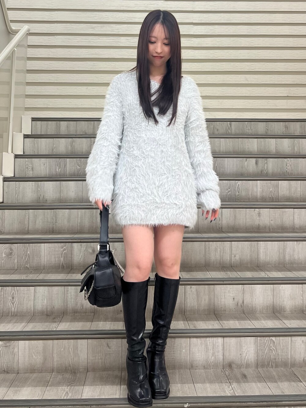 [トップス] ラメが写真映え間違いなしのチュニックです♡肩を落としてオフショルでも着ていただけます! [バッグ] ポッケが沢山付いた大容量のハンドバッグです♡内側にもポッケがございます! [シューズ] 足にフィットしてくれ太めのヒールで長時間でも疲れにくいブーツです♡足のサイズ22.5cmでMサイズ着用しております!