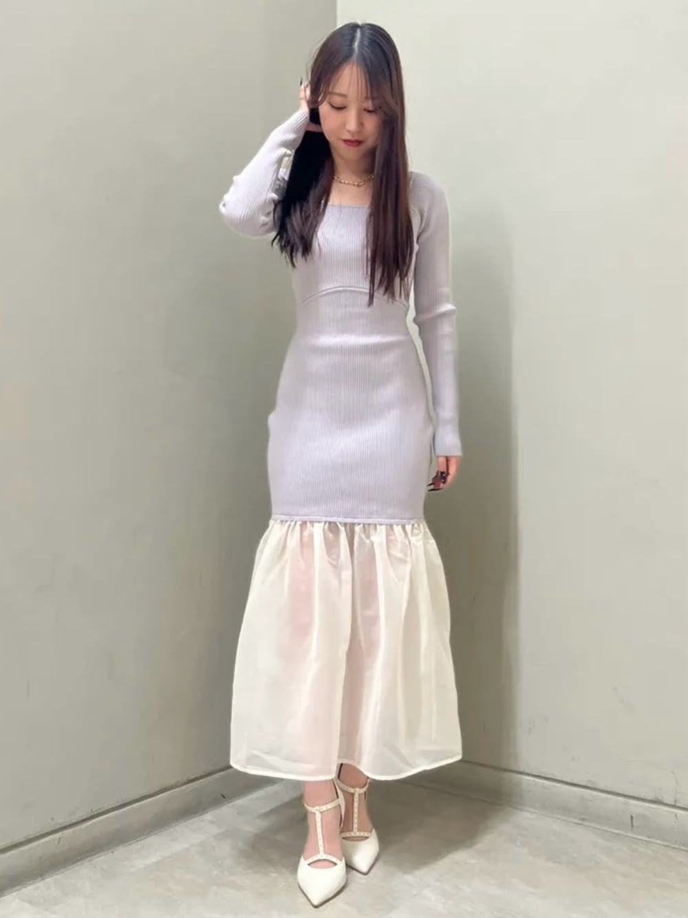 [ワンピース] 膝上辺りからシアーになった春らしいワンピースです♡ラインをキレイに出してくれるとニットとふわっとなった裾のバランスがとても可愛いです! [ネックレス] パール付きのネックレスです♡どんなコーディネートでも合わせられる万能アイテムです! [シューズ] スタッズ付きで足元が華やかに見えるシューズです♡足のサイズ22.5cmでSサイズ着用しております!