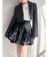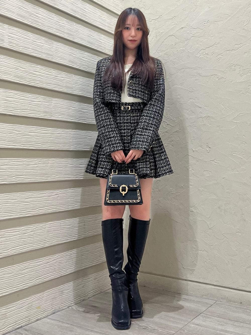 [ジャケット] クロップド丈でスタイルが良く見えるツイードジャケットです♡ジャケット×デニムパンツの合わせもおすすめです! [スカート] ふんわり感が可愛いツイードスカートです♡動く度にツイードのキラキラが可愛さを増してくれます! [トップス] 袖口にゴールドのボタンが付いたシンプルなトップスです♡スカート、パンツ問わずどんなコーディネートでも合わせられる優秀アイテムです! [バッグ] ゴールドのチェーンが可愛いコンパクトバッグです♡ショルダーバッグとしてもハンドバッグとしてもお使い頂けます! [シューズ] 足にフィットしてくれ太めのヒールで長時間でも疲れにくいロングブーツです♡足のサイズ22.5cmでMサイズ着用しております!