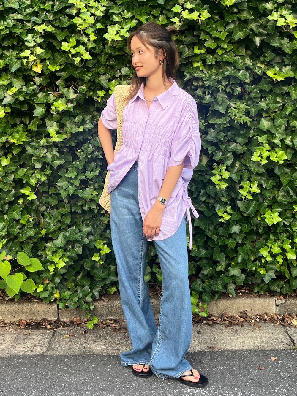 【tops】 毎年大人気のギャザーシャツ👔 155cmでFサイズを着用しており、 お尻が隠れるくらいのルーズなサイジングです🤍 サイドの紐をぎゅっと絞れる1枚で可愛いデザイン😶🌫️ デニムとのカジュアルな組み合わせも可愛いですが、 ワンピースなどの羽織としても大活躍です🥰 【bottom】 柔らかさに感動したデニムNo.1✨ ハイウエストで腰回りはフィットする仕様。 ルーズ過ぎずタイト過ぎない形でまさに理想のデニムです😉 着回し力抜群で何にでも合わせやすいストレートデニム‼︎ 最強デニムの誕生です🥹 ブルーが8オンスでアイボリーが10オンスなので、 2色で柔らかさがやや異なります👌🏾 是非店頭でこの感動を味わってください❤️ 155cmで24inchを着用しており、 フラットシューズだと地面につく長さです! ロールアップや高さがあるシューズ合わせがお勧め👞 【shoes】 普段は22.5〜23cmでSサイズで◎ 細いストラップでどんなコーデにも合わせやすい1足🩴 この夏絶対持っておくべきアイテム☀️