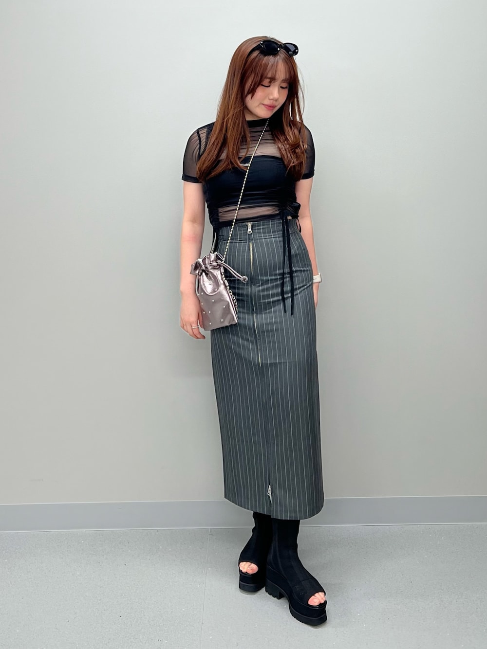 (トップス)サラッとした着心地のシアーシャツ。フリーサイズ。自分の骨格に合わせて紐で調節出来るので細見え効果抜群です!!! インナーに来ているカップ付きのブラトップはフロントの金具がポイントです✨ (スカート) ジップスカート。163センチでSサイズ着用。タイトめで体のラインを綺麗に拾ってくれます。サラッとした着心地なのでストレスフリーです!ジップを深めに入れると歩きやすくもなります✨ (シューズ)ムルーアと言えばこのシューズ。とにかく軽いです。びっくりするぐらい軽いです。厚底10センチとは思えないくらい盛れるし歩きやすいしおすすめです!!!23.5センチでぴったりでした。