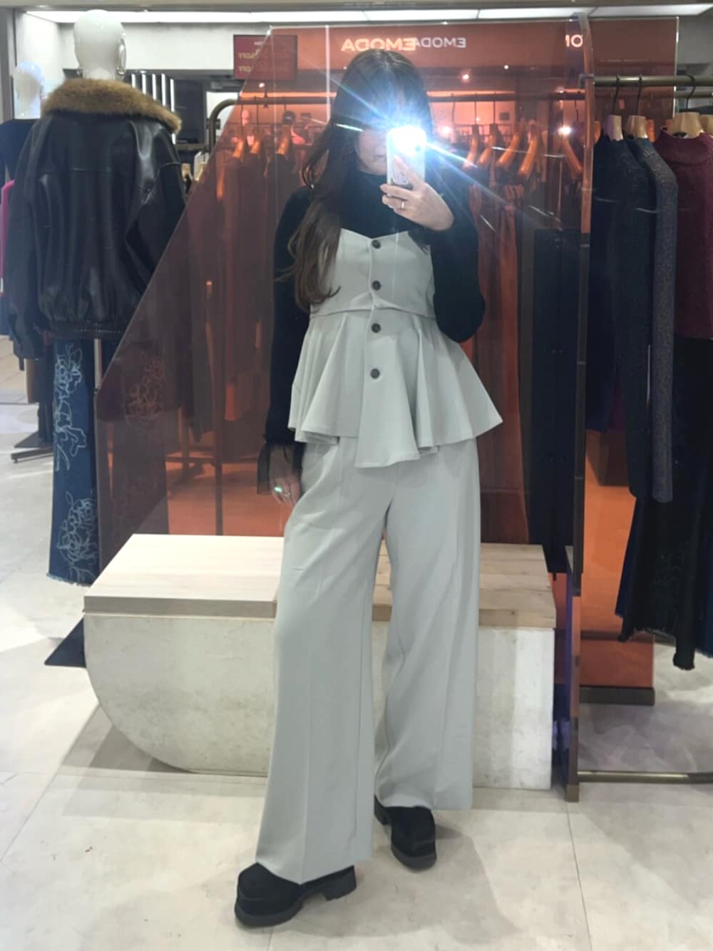 (ビスチェ)2wayになっているビスチェ!ウエストはゴムになっていて楽ちん♡肩紐も調節出来るので、着心地も抜群です! (パンツ)163センチでSサイズ。スラックス生地でタックも入ってます! (シューズ)厚底10センチ。傾斜がないので安定感抜群。23.5センチでぴったりでした。