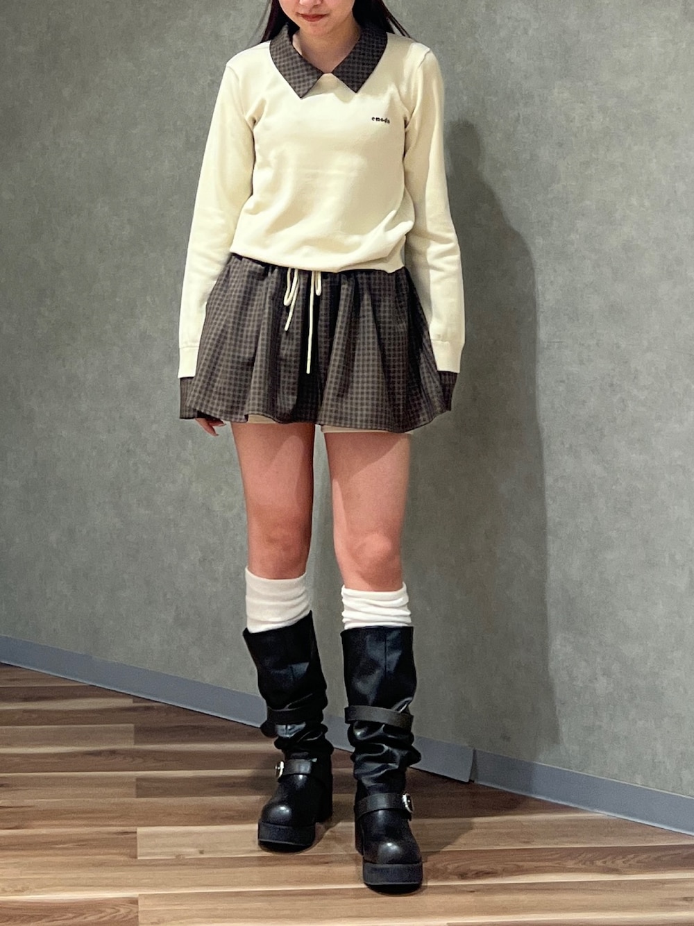 【トップス】 首元の襟は取り外せます◎ 【スカート】 パンツとレイヤードになってるので見せてはくのがトレンドです! 【ブーツ】 めちゃくちゃ軽くて歩きやすいです! 普段23.5cmでMサイズピッタリです!