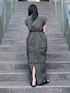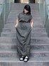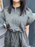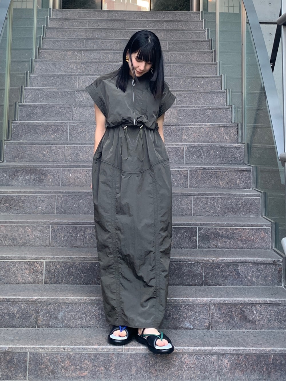 【ワンピース】 ウエストでブラウジングしたようなシルエットがポイントのワンピースです。 二の腕が隠れるデザインの為、安心感があります。 フロントはあえてゴツめの金属ファスナーにして、ミリタリーテイストもありつつモードな印象にもなります。 軽い素材で程よく光沢感がある様になる1枚です。