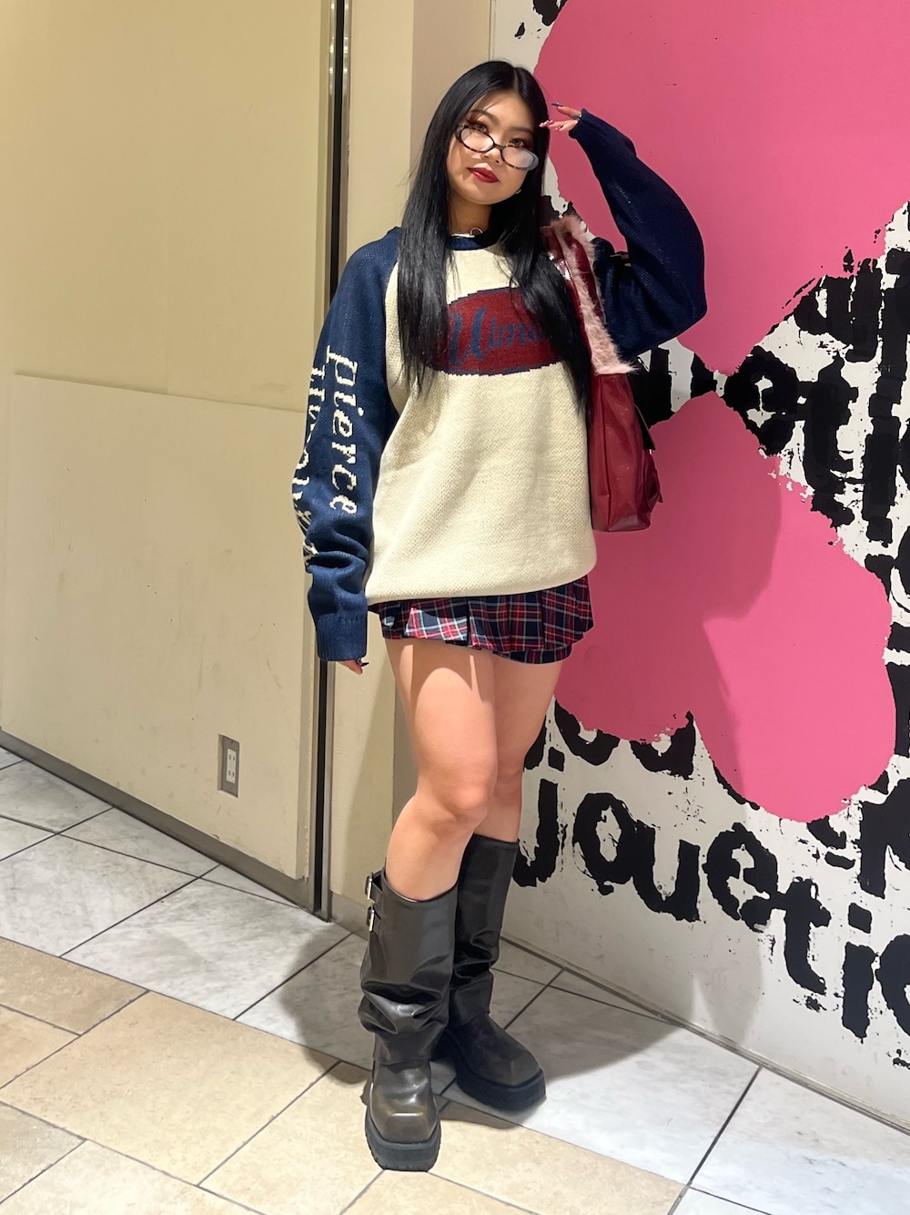 【トップス】 ルーズなサイズ感が可愛いラグランニット💙今年はスリーブにもロゴが入っていて存在感抜群!ミニボトムとの合わせも、デニムやロングスカートとの合わせもオススメです! 【ボトムス】 韓国で流行中のスカートパンツ🧸プリーツスカートの部分が短めなことによって脚長効果バツグン!クロップド丈のトップスを合わせてウエストのベルトを見せるのもおすすめです☝🏻 【シューズ】 ボリューム感が脚を細く見せてくれるカバーブーツ!普段24cmでLサイズ着用してます。スクエアトゥでつま先広めなのでMサイズでも履けました◎足元大きめが好きな方はLサイズがおすすめ🌟