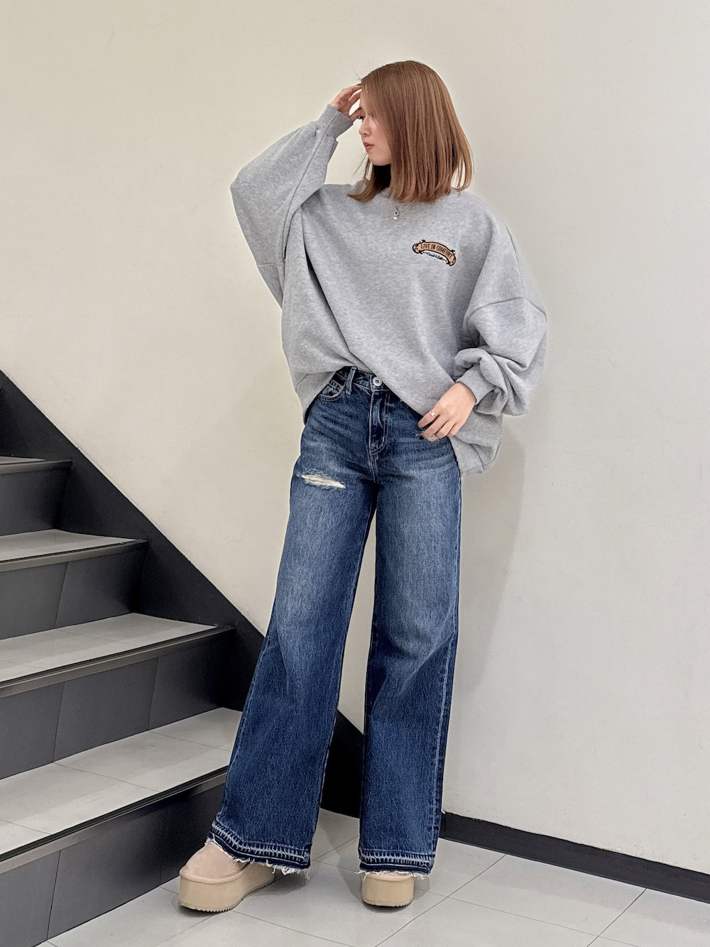[トップス] ロゴの配色が可愛すぎるドルマンスウェット🩶 お尻がすっぽり隠れる位の丈感になる為、1枚でワンピース風に着てロングブーツ合わせなど可愛いです💗 [ボトムス] 凄く形の綺麗なデニムパンツ🩵 ショート丈のトップスと合わせても、パーカーと合わせても可愛い、どのアイテムとも相性抜群のデニムパンツです😌 160cmでSサイズ着用してます。 [シューズ] この冬大活躍のムートンブーツ🤎 Mサイズで厚底6.5cmありますが、フラットソールの為、凄く歩きやすいブーツです😊 23.5cmでMサイズ着用してます。