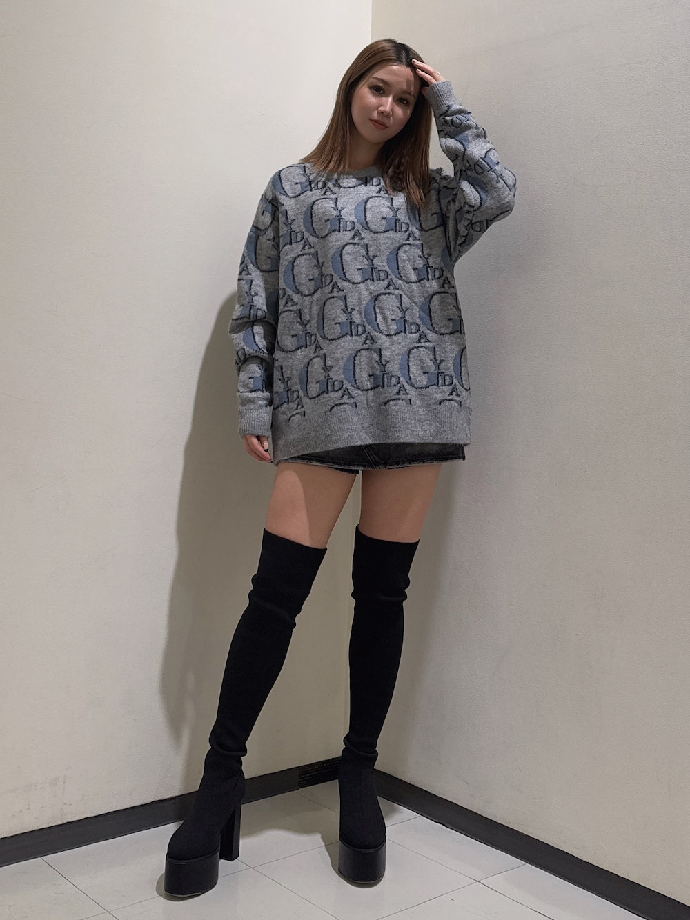 [トップス] GYDAの総柄が入ったニット🩶 生地がモチっとしていて、肌触りのいいニットです💁🏽♀️ 着丈は62.5cmあり、ワンピース風でもデニムパンツと合わせても可愛いです❣️ [ボトムス] 毎日のように履いているデニムスカート🩶 インナーパンツが付いている為、ミニスカートですが安心して履いて頂けます💁🏽♀️ ショート丈のトップスと合わせても可愛いです♡ 160cmでSサイズ着用してます。 [シューズ] 太ももまで隠れるサイハイブーツ🖤 ニット素材を使用している為、履き心地が良く着脱もしやすいブーツになります✨ ヒールは11.5cmになります。 23.5cmでMサイズ着用してます。