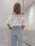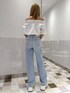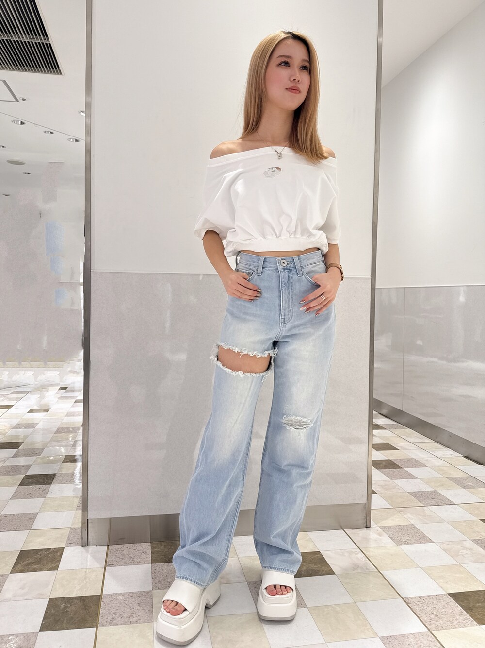[トップス] オフショルで着て頂けるトップス🤍 一見シンプルですが、胸元のロゴが目立って可愛いトップスになります❣️ [ボトムス] 毎年大人気の太ももにダメージのあるデニムパンツ🩵 ストレートとワイドパンツを合わせたようなデニムになります☺️ 形が綺麗で足が長く、細く見える作りになってます😊 これからの時期、ビスチェと合わせるとGYDAらしいコーデになります💁🏼♀️ [シューズ] 厚底サンダル🤍 全体的に厚底になっている為、とても履きやすくオススメです😊 ヒールは11.2cmになります。 23.5cmでMサイズ着用してます。