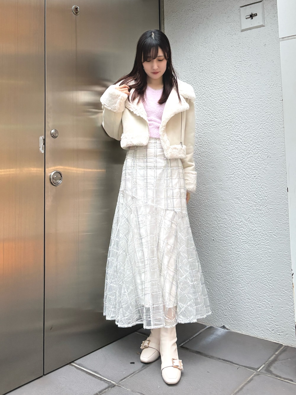 冬のシーズンムード高まるホワイト×ピンクコーデ🦢 » knit ベーシックで着回しやすいシャギーニット。 前後2way仕様で、Vネック・ラウンドネックを気分でお楽しみいただけます◎ » skirt きらきらのモールが冬らしい、アシンメトリーデザインのスカート⛄️ 程よい透け感とふんわり感で、華やかさを演出します。 » outer 毎年人気の定番ライダース⸜❤︎⸝ 袖のファーは、折り返せばコンパクトでスッキリとした袖丈に、ファーをすべて伸ばせば手までしっかり暖かくご着用いただけます。