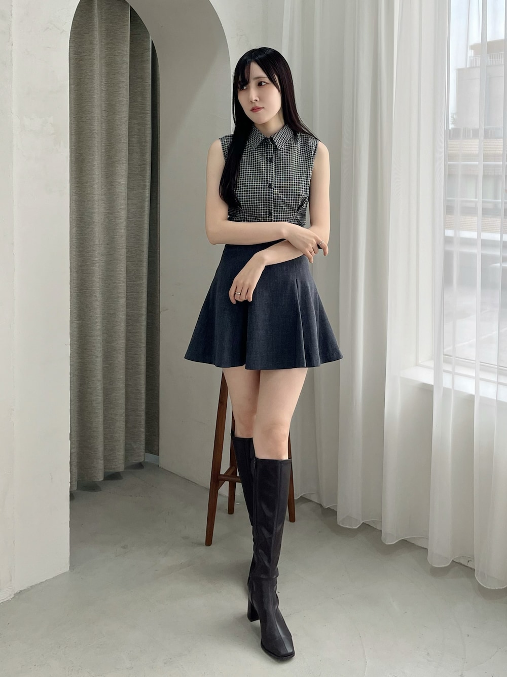 » shirt カーディガンがセットになったノースリーブシャツは、夏から秋まで大活躍◎ ジャンパースカートのインナーにもおすすめです。 » skirt ハイウエスト&フレアシルエットでスタイルアップ効果抜群のミニスカパン。 インパン付きで見にでも安心してご着用いただけます。 167cm / Mサイズ