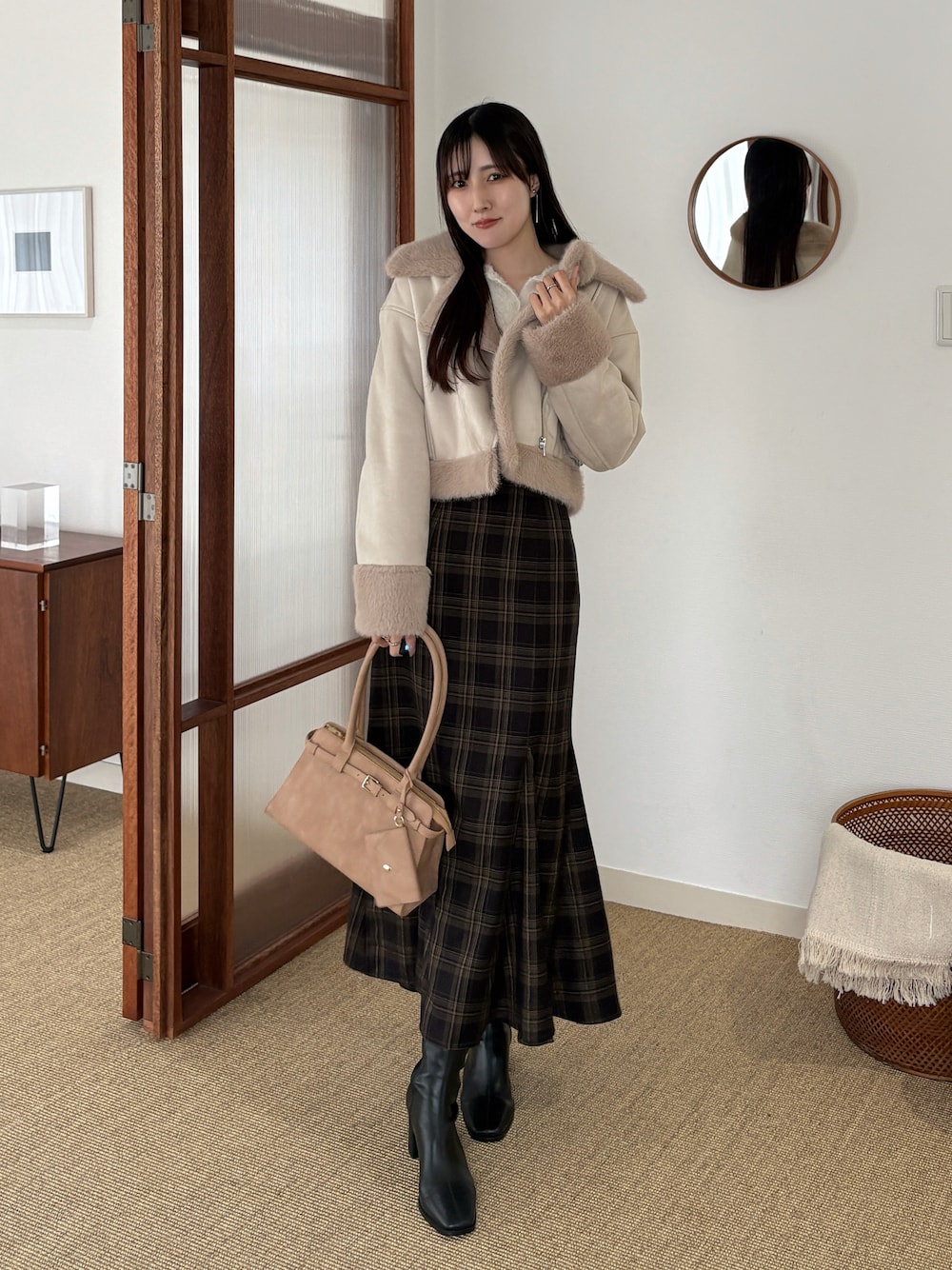 » outer ふわふわのファーに包まれるムートンコート。 短丈のライダースデザインで、着膨れしにくく綺麗にまとまります◎ » skirt きゅっと引き締められるバックレースアップが嬉しいマーメイドスカート。 温かみのある生地で、冬のスタイリングにピッタリのアイテムです。 ◾︎着用サイズ(167cm) アウター/スカート:Mサイズ トップス:FREE ブーツ:38