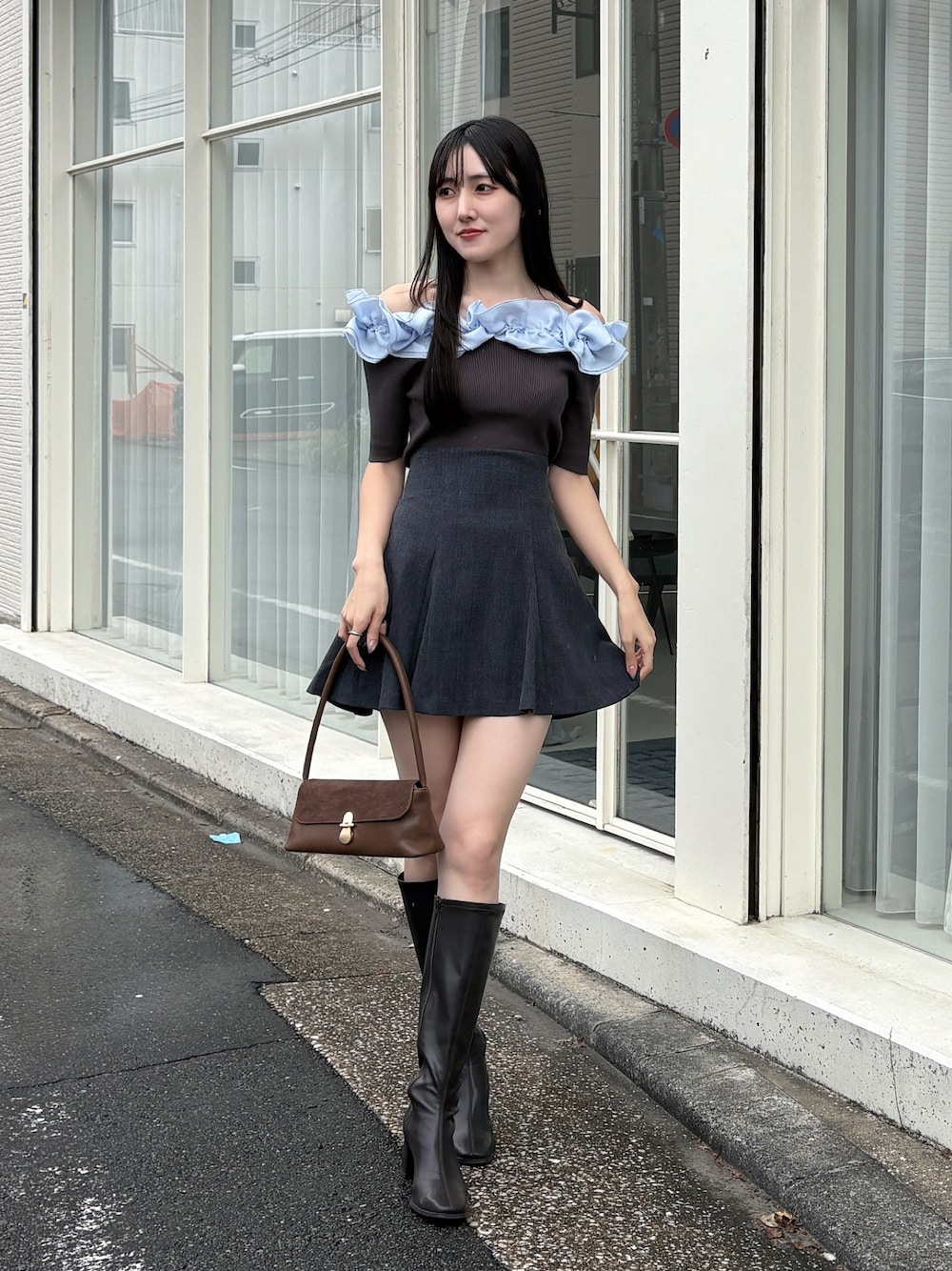 » tops ぷりっと可愛らしいフリルが魅力のオフショルニット。 ボリュームたっぷりのフリルがデコルテを華奢に見せてくれます。 » skirt 裾に向かって広がるシルエットがウエストを細く見せてくれるミニスカパン。 うしろのジップがスタイリングのワンポイントに◎ 167cm / Mサイズ