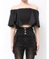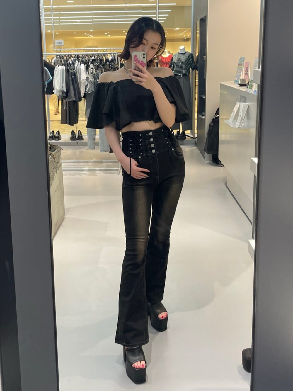 【トップス】 オフショルでも着れる2WAYタイプのカットソー! ボリュームのあるフレアスリーブで二の腕を綺麗にカバーしてくれます。 【ボトムス】 レースアップのリボンが目を引くフレアデニム!! ハイウエストで露出が増える夏服と相性抜群です! ストレッチが効いているので履き心地も良いです。 【シューズ】 14センチも盛れる厚底サンダル! ストームが8センチ近くあるため傾斜が少なく安定感のあるサンダルです! フレアデニムはもちろん、スカートの時などはソックス合わせもかわいいです!