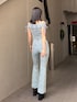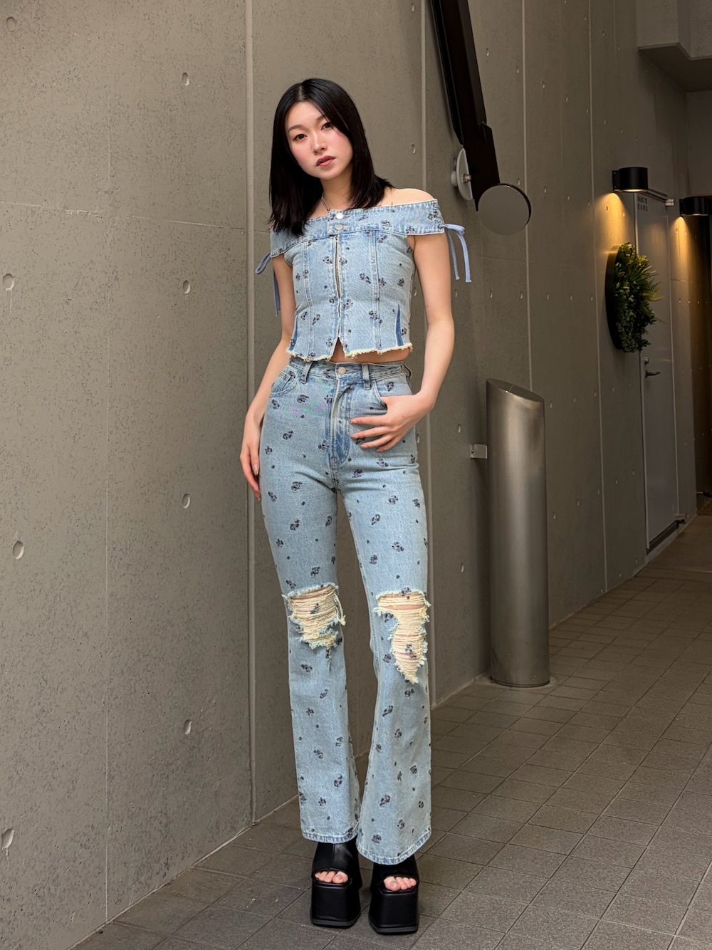 【トップス】 小花柄の刺繍何かわいいデニム生地のオフショルダートップス。 肩がレースアップになっていて目を引くでざいんです💕 ダブルジップで丈感調節ができます! 【ボトムス】 トップスとセットアップで着れるフレアデニム。 膝よりも少し上にダメージがあるので膝位置が高く見えます!! 【シューズ】 ヒール13センチの厚底サンダル! シンプルなデザインで様々なコーデに合わせやすいです! 24.0センチでMサイズ着用してます!