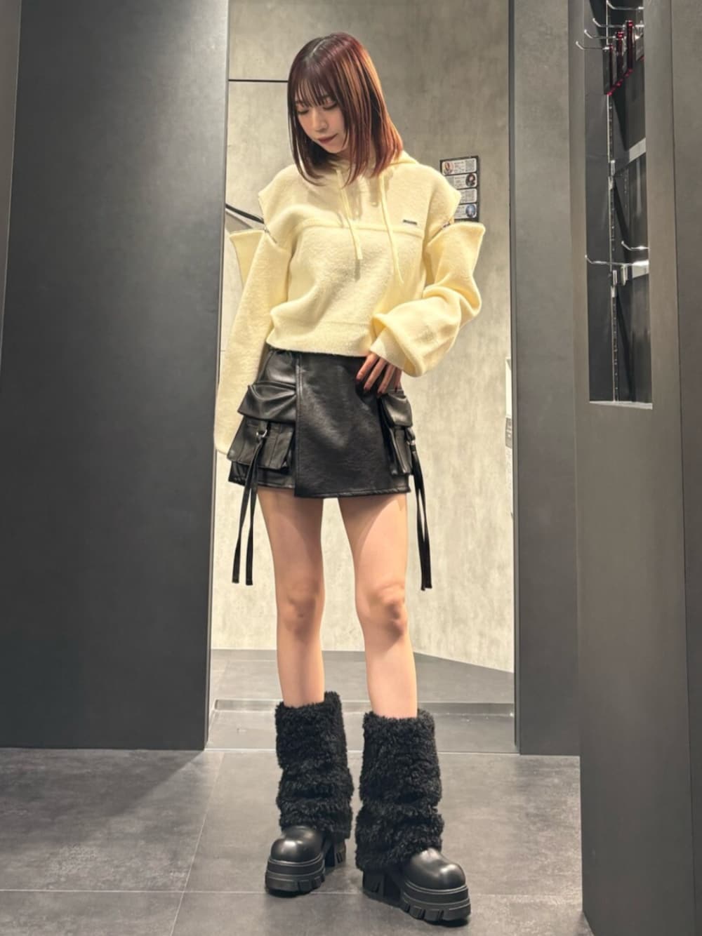 【トップス】腕のとこにファスナーついてて開けて着ると抜け感出て🙆♀️柔らかい生地でもちもちしてて着心地最高👍 【ボトムス】前から見たらスカートだけど、ガッツリショートパンツなので安心して履ける⤴︎⤴︎デザイン性あるから着るだけでコーデのアクセ ントに🖤 【シューズ】履くだけでオシャレ度UPするテディブーツ🧸靴にボリュームあるので自然と脚が細見えする👀23.5でMサイズ着用